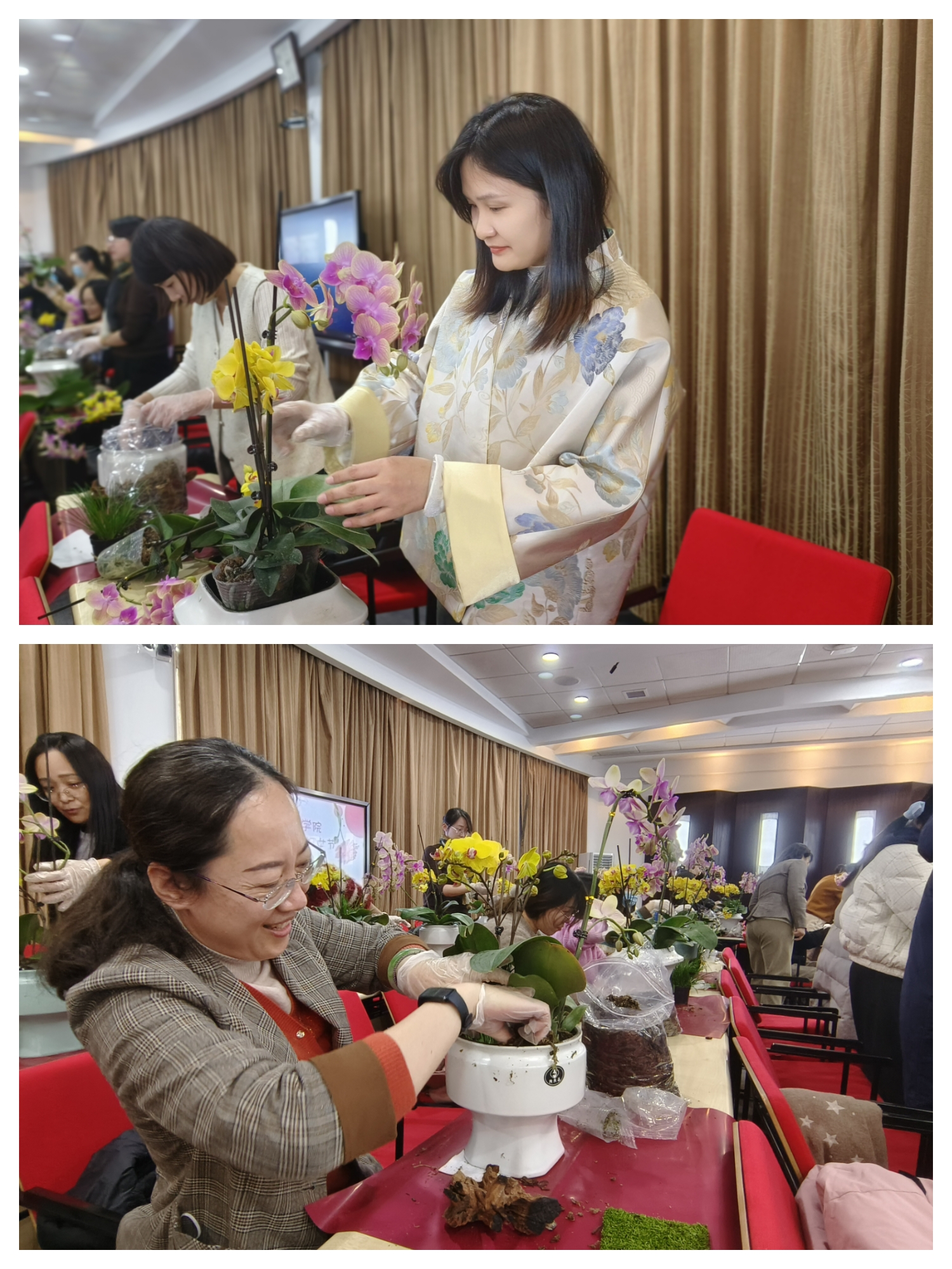 主持人首先转达了学院党委对全体女性教职工亲切祝福和美好祝愿,活动在亲清和谐的氛围中展开。倪老师为大家讲授了此次插花制作的设计理念以及选花、养护、颜色搭配、造型等艺术技巧,分享了各种花材蕴含的花语和祝福。各位老师面对文气十足的菖蒲、朵朵绽放的蝴蝶兰、造型独异的沉木和各色花器,拿起工具、插入花材,认真构思、反复斟酌、细致调整,创作出一盆盆错落有致,生机盎然、独一无二的插花作品。蝴蝶翩翩芳草意,一枝一叶园丁情。