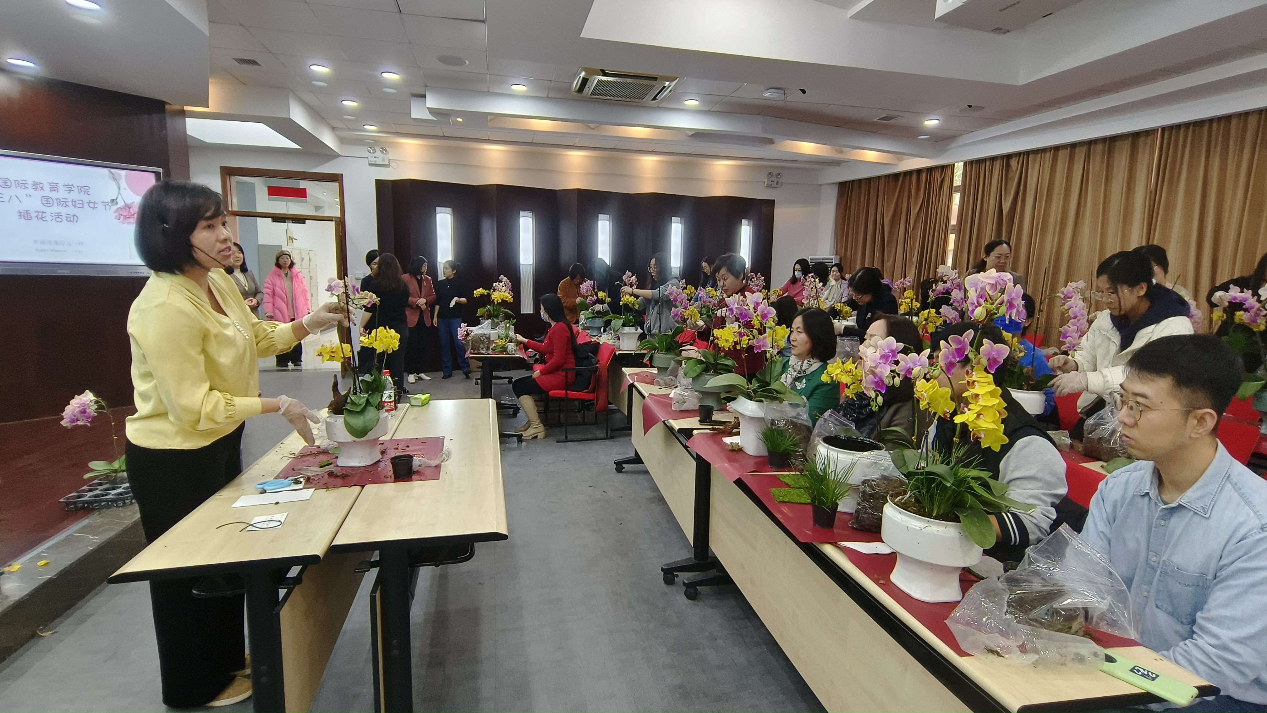 3月7日下午,beat365英国官网工会面向全校教职工开展“幸福得像花儿一样”自然美学主题插花艺术体验活动,以美的技法和美的心灵,体悟育人之道,以中华优秀传统文化之美,涵养教育家精神。beat365英国官网教职工、学校部分职能部门及其它学院教职工共计60余人参与了插花活动。中华传统文化研究与体验基地课程合作教师倪贵美讲授指导,beat365英国官网工会主席王勤主持活动。