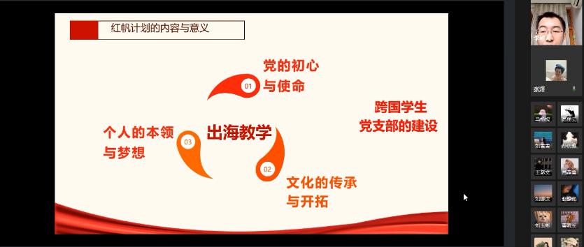 “红帆计划”立足支部成员出海教学这一专业特色,将自2020年4月起,历时两年时间,陆续开展“信仰领航”“本领护航”“梦想导航”三个板块的活动,引领支部成员将国家使命与理想信念教育紧密结合,将个人梦融入中国梦,以青春梦托起中国梦,帮助支部成员不断提升政治素质与实践能力,在海外“讲好中国故事,传播中国声音”。活动体现了支部建设与学生成长的有机结合,探索海外学生党建新模式,为建设组织有力、凝聚有力、工作有力的学生党支部做出积极尝试。