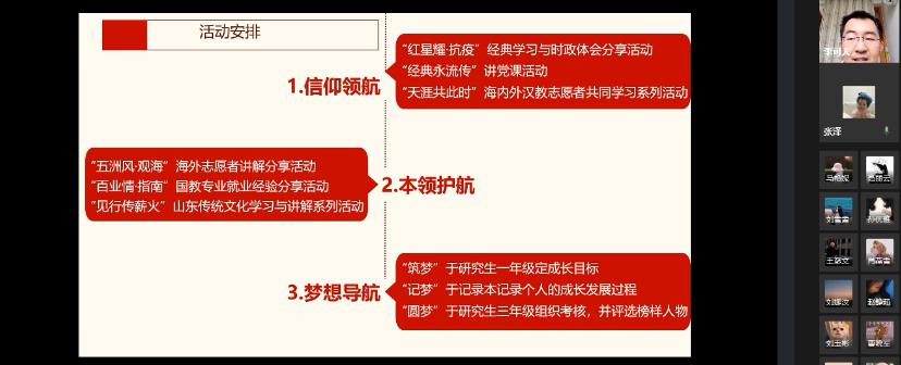 本次活动分为上下两部分:“红帆出海,青春扬帆”启动仪式和“筑梦破冰”志愿服务经历分享环节。启动仪式上,2018级研究生党支部书记梁恬怡分享了支部党员海外汉语教学的经历,出海教学既让支部党员快速成长,也为支部发展注入了新的动力。2019级研究生党支部书记李可人介绍了“红帆出海,青春扬帆”支部党员成长计划的内容与意义,“红帆计划”贯连党的初心与使命、文化的传承与开拓、个人的本领与梦想三个基本点,内容包括“红帆起·筑梦”活动启动、“红星耀·抗疫”理论时政学习、“成长路·记梦”党员成长记录手册、“五洲风·观海”海外志愿者经历分享、“百业情·指南”就业促进等活动版块。党委副书记王璐璐作为联络支部的党委委员,参与指导了支部活动的开展,她谈到,“红帆计划”立足于党员的责任担当和成长需求,有利于促进支部的建设,支部党员要特别加强对中国特色社会主义制度和治理体系内容的学习,将支部打造成为一个“学习型、专业型、实践型、创新型、示范型”五型一体的党支部。马艳妮谈到,“红帆计划”是一个具有实践意义和理想模型的活动,既关注了党员的个人成长,也发挥了党支部的战斗堡垒作用,希望党支部能够扎扎实实地做好每项活动,让每个党员都能够得到成长。