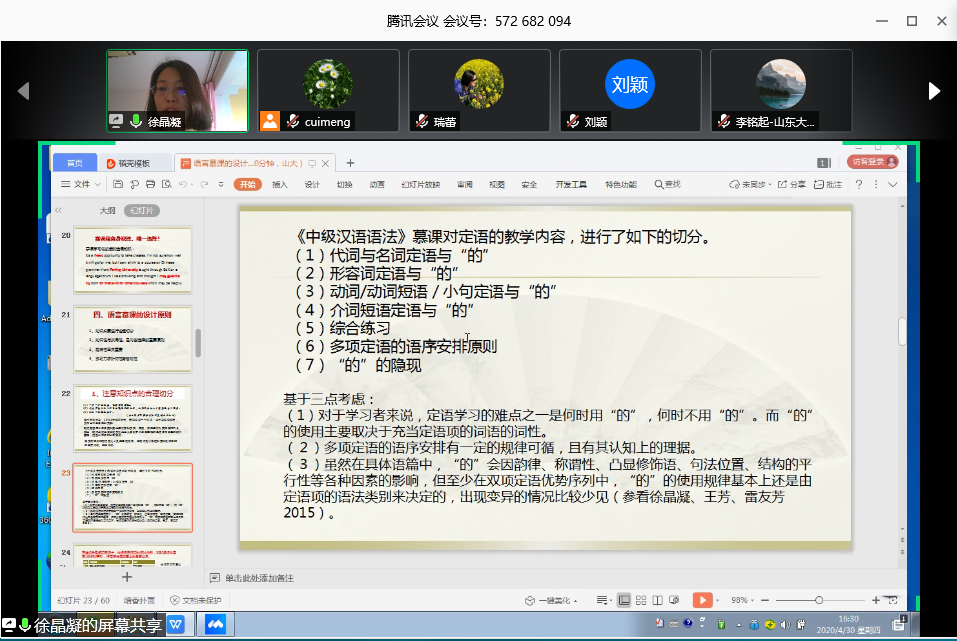 4月30日,学院通过腾讯会议平台,面向全体任课教师举办第四十四期专题工作坊,主题为“语言慕课的设计与评价”,主讲人为北京大学对外汉语教育学院博士生导师徐晶凝教授。副院长王彦伟主持本次活动。