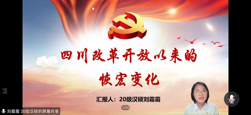 首先,2018级研究生党支部代表梁恬怡从住房、医疗、教育等方面介绍了天津自改革开放以来的发展变化,并表示我们应该珍惜当前的发展成果,把个人理想追求融入党和国家事业之中。随后,2019级研究生党支部代表谢秉哲、刘玉彬分别介绍了家乡江苏南京、甘肃酒泉的发展变化。谢秉哲以南京公交车的变化为缩影,展现了家乡生产力、人民生活水平等方面的巨大变迁;刘玉彬通过新老照片的对比,展现了改革开放的春风给酒泉带来的变化。接着,2020级研究生党支部代表刘霜霜以大量数据反映出四川“蜀道难,难于上青天”的时代已一去不复返,并为家乡的发展提出了自己的建议;刘玫苑讲述了山东烟台昆嵛山保护区人民生活的变化,她谈到,党的十八大以来,家乡发展政策与理念的转变实现了经济与生态效益的“双丰收”。最后,本科生党支部学生代表高静雨、李晓祺通过聚焦“小城故事”,讲述了家乡山东德州、昌邑如何不断满足人民日益增长的美好生活需要。