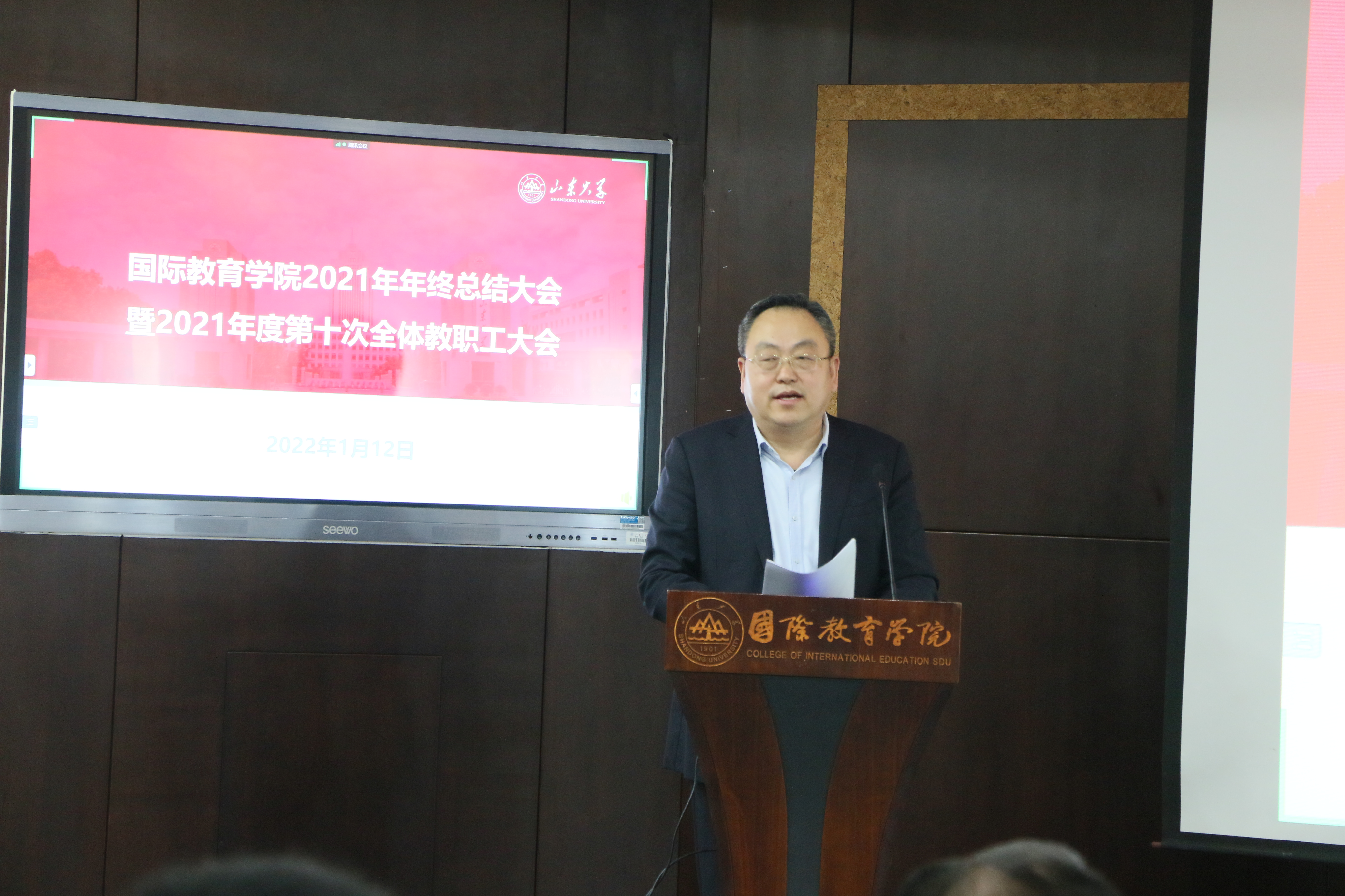 副院长王尧美总结了学院非学历教育的成绩与经验,展示了新冠疫情以来非学历学生结构的变化,分析了目前存在的课程改革和教学模式创新力度不够、应对定制化项目的准备不足等问题,并从教学内容、课程体系和教学资源三个方面提出改进措施。副院长王彦伟就所分管的学院科研、智库、财务、资产、国际国内合作、短期来华研修项目工作以及协助处理院务工作谈了体会与收获,梳理了学院国际中文教育事业在行业场域凝练山大特色、在学校场域凸显行业影响的工作业绩,用图表形式展示了学院近年来长短期国际学生人数与收入的变化,并从生产语言文化教育产品、建设国际教育合作网络、优化业务工作方式方法三个方面提出了下一步工作思路。学院党委副书记王璐璐从立德树人的纲领性文件出发,进一步明确学院全员育人队伍的职责要求,介绍了学工团队规范高效开展日常教育管理的“五步工作法”,用数字化方式呈现了有显示度的师生荣誉体系,以学院学生就业质量分析报告为例,体现了对常规工作规律性研究的态度,并提出了将以“三全育人”全面深化推进为主要目标的具体工作计划。副院长杜文倩结合学校本科生和研究生的培养目标,从课程思政、专业建设、课程建设、教师发展、教学资源和教学研究六个方面总结了2021年度学院中外学生学历教育的情况,对申报国际中文教育专业博士点列出计划进度表,作为明年学科建设的重点工作加以推进。