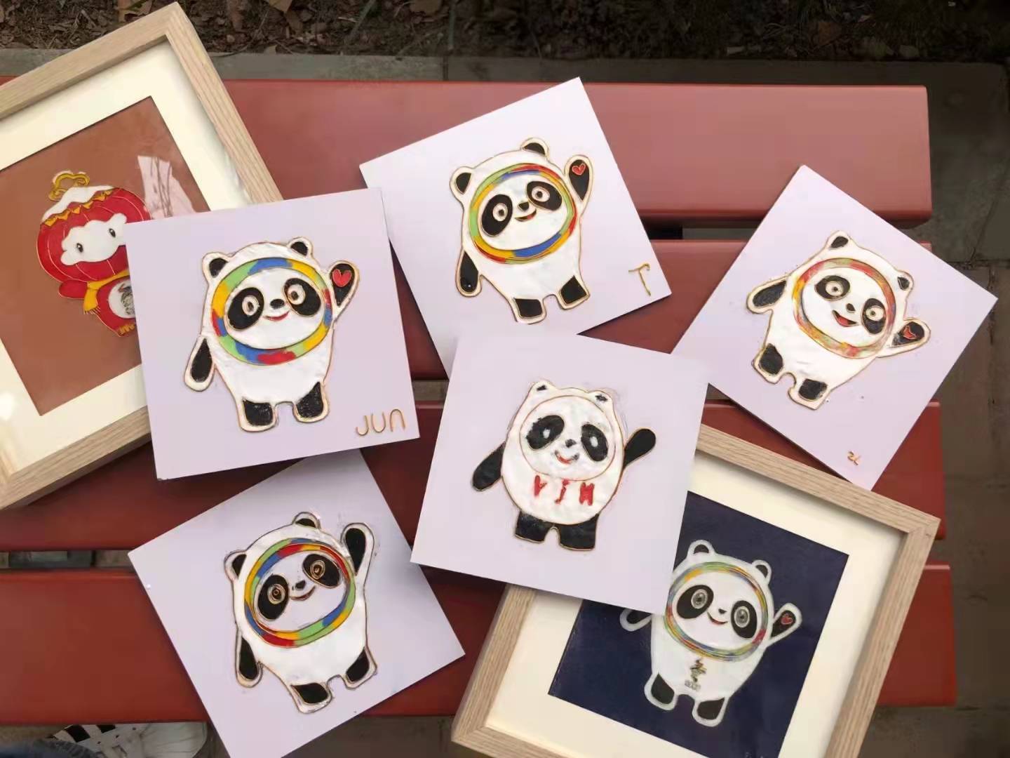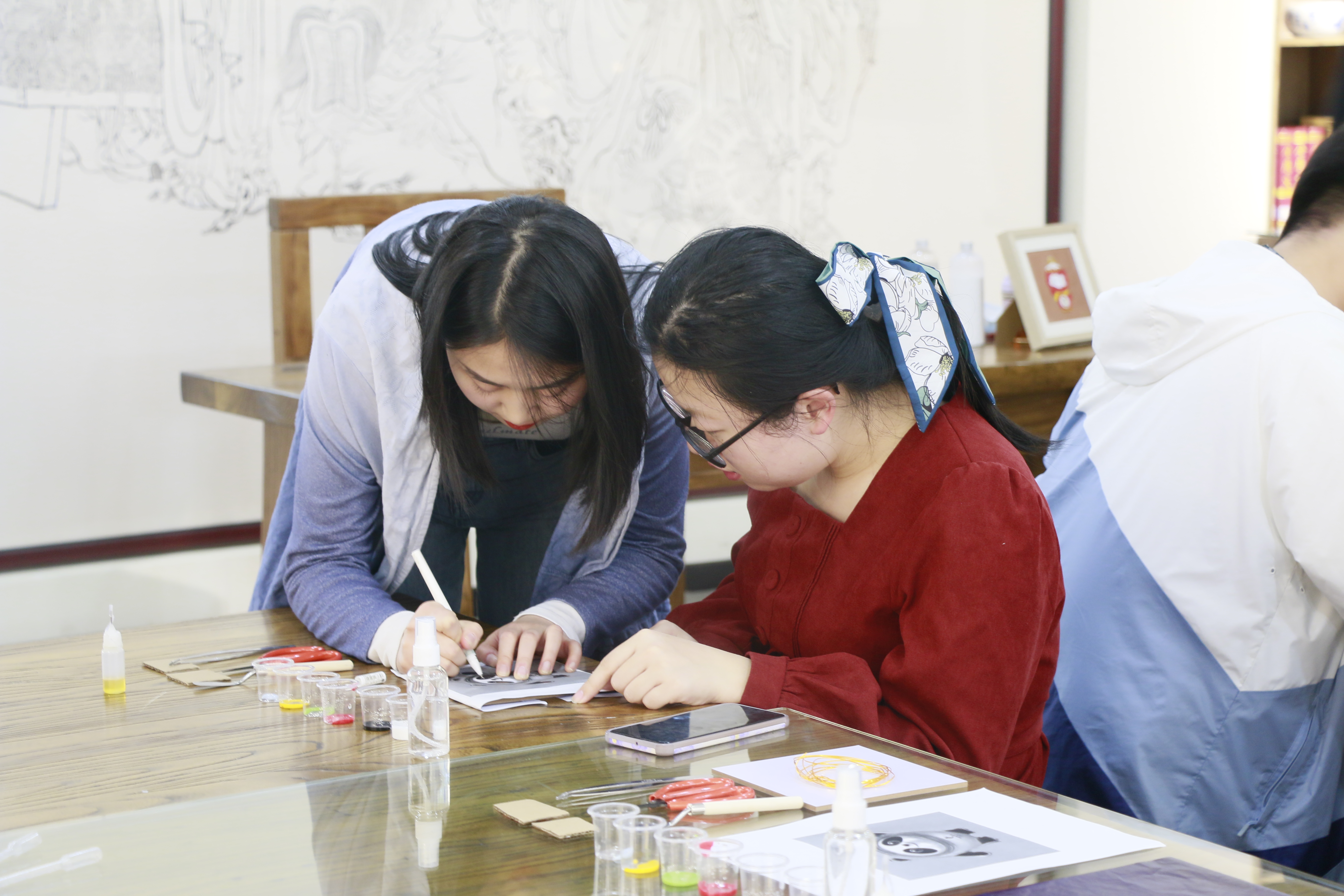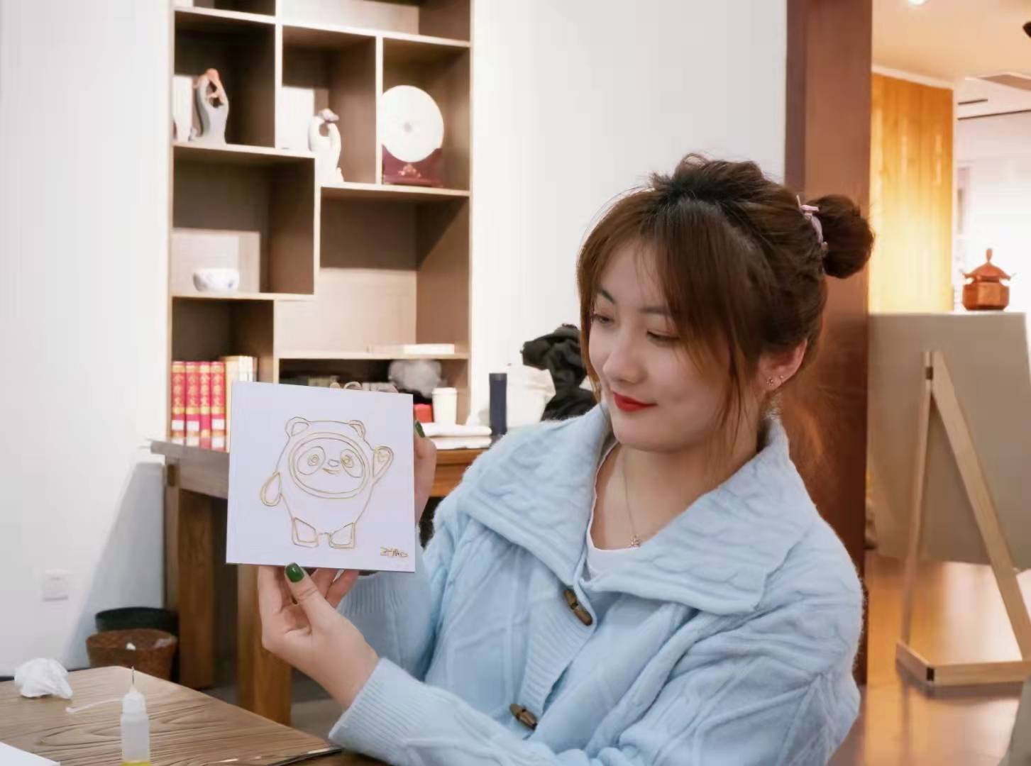 “景泰蓝”正名“铜胎掐丝珐琅”,历史悠久,工艺复杂,有“一件景泰蓝,十件官窑器”美誉。鹿瀚文结合团队参与“中华文化创未来”项目文创研发的成果,简要介绍了景泰蓝非遗技艺的发展历史、制作过程与精湛工艺,并指导同学们运用景泰蓝这一中国传统工艺技术创作一幅属于自己的“冰墩墩”创意画。描图、掐丝、点蓝、覆膜……,“冰墩墩”的形象在同学们手中一点点生动了起来。三个小时的文化体验,既有传统与现代结合,又有古老技艺与流行元素碰撞,让同学们对掐丝珐琅技艺有了更具体的认识,同时也对非遗技艺的现代传承与创新有了更直观的感受。