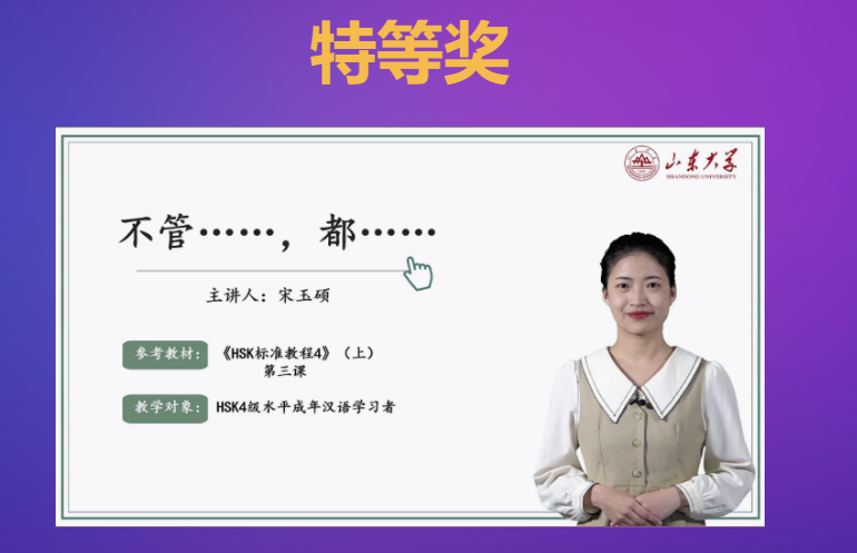 3月16日,“2021全球中文教学微课交流展示”活动获奖名单揭晓,山大学子表现优异。汉语国际教育专业学位硕士研究生宋玉硕获全国唯一特等奖,刘晓洁、岳昕燃、常胜洁获三等奖,梁世娜获优秀奖。在青年教师组比赛中,国际教育学院教师李晓婧、付瑶分获二等奖和三等奖。