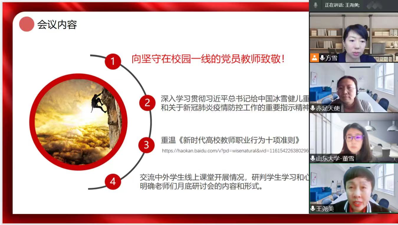 4月15日起,各教工党支部围绕“线上课堂 党旗飘扬”主题,按照学校与学院部署要求,结合支部具体工作,陆续开展“三会一课”、主题党日活动。