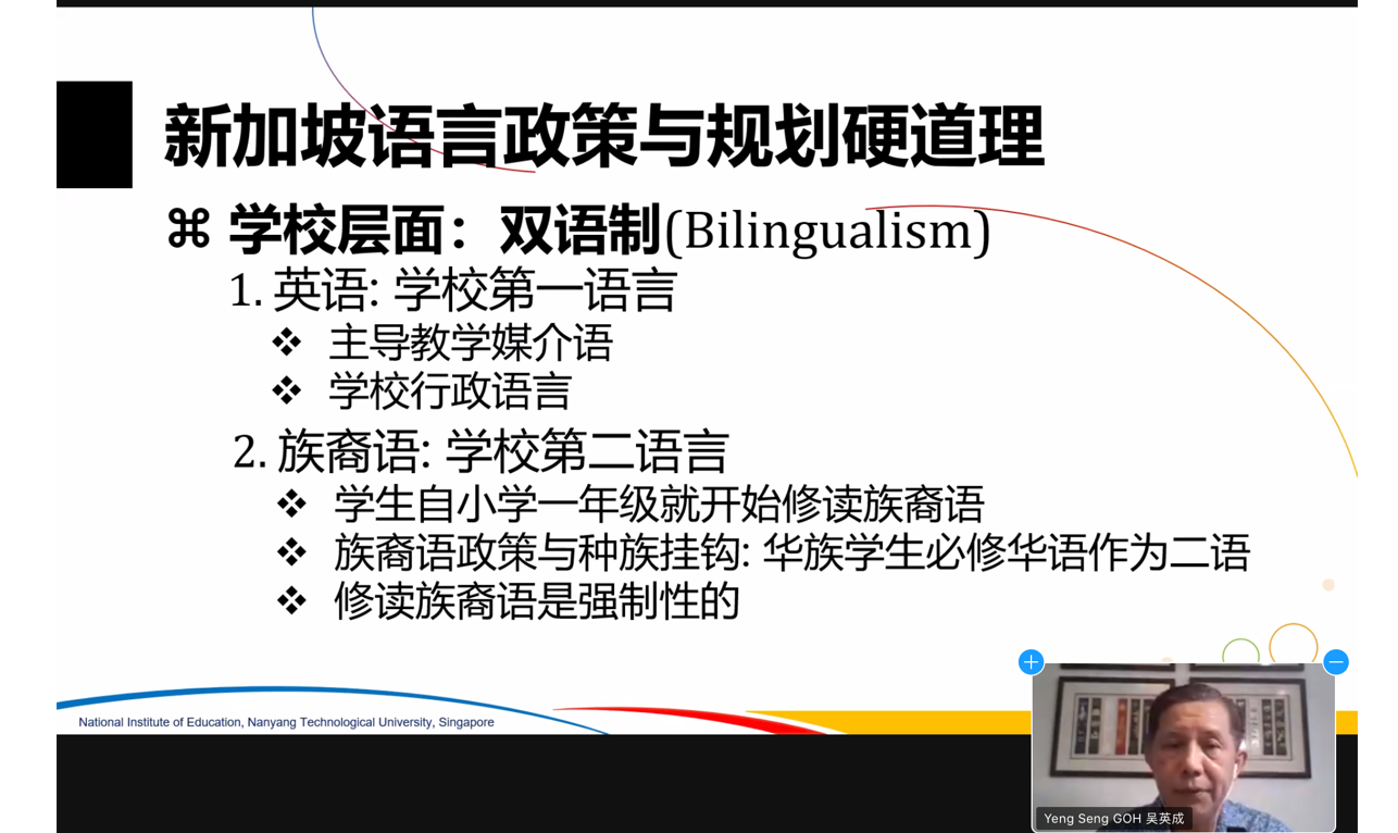 本场讲座为beat365英国官网2022年春季学期境外专家教学流动岗专题系列讲座,将以“华裔华文+国际中文:重新定义新加坡华裔语言教育”“语言内外双循环:国际中文教育可持续发展新战略”“国际中文教学与学术活动:线上线下协同新模式”“游走于东西方学术之间:我的学思历程”为题开展四期主题课程讲座,讲座内容以走近新加坡为起点,探讨语言内外双循环下国际中文教育可持续发展的新战略,并聚焦新形势下国际中文教学线上线下协同的新模式,最后回归吴英成教授自己游走于东西之间的求学经历,分享身为一位学者的学思历程。