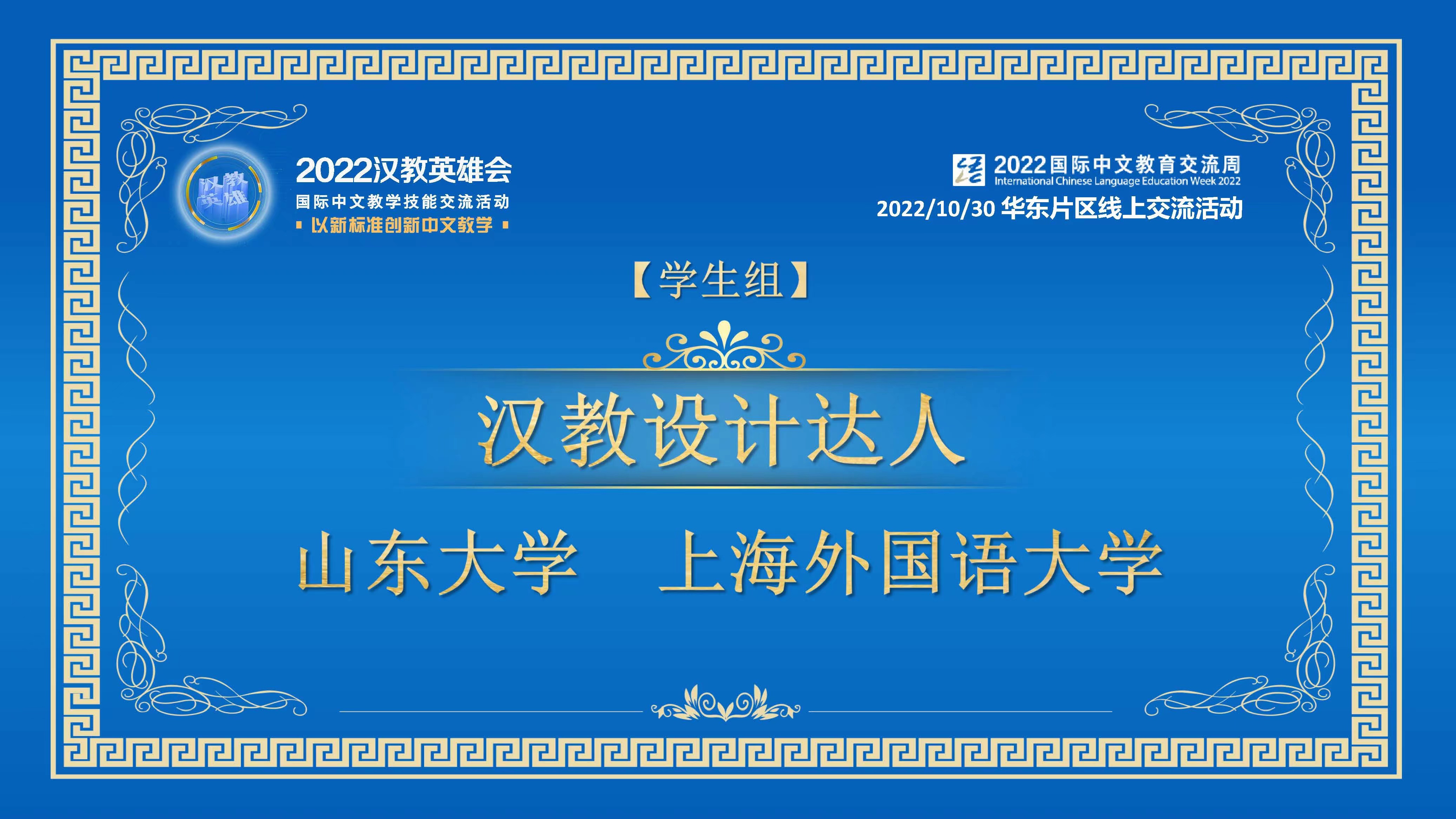 近日,由教育部中外语言交流合作中心、全国汉语国际教育专业学位研究生教育指导委员会联合举办的2022全国“汉教英雄会”华东片区国际中文教学技能交流活动圆满落幕,来自华东片区50余所院校的团队通过云端登台亮相,分享教学理念,展示团队风采。beat365英国官网beat365英国官网组建的beat365英国官网学生团队在参与交流活动的62支院校团队中脱颖而出,获得学生组“汉教设计达人奖”。