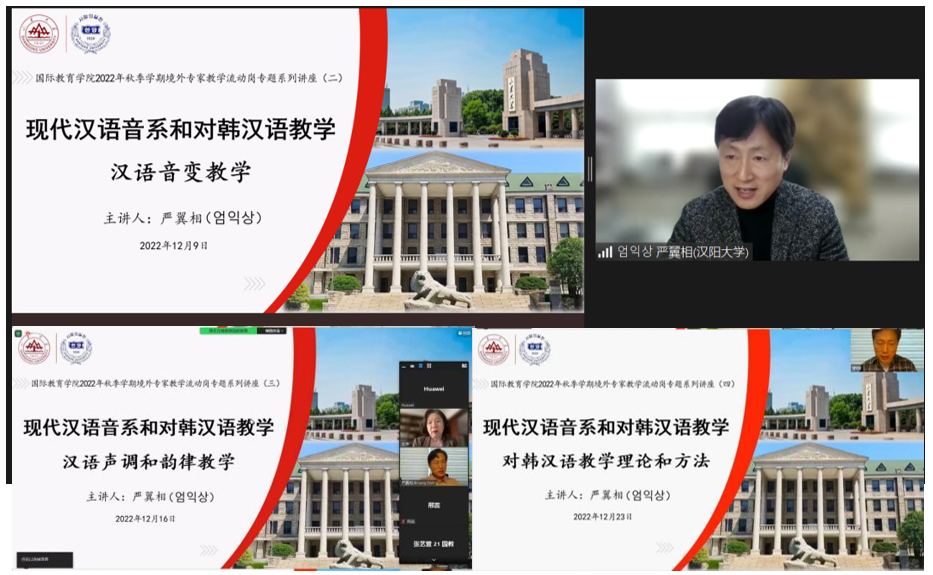 为进一步推动我院与韩国高校开展国际中文教育领域科研和人才培养合作,2022年12月,学院邀请韩国汉阳大学严翼相教授为本研学生开设境外专家教学流动岗系列讲座,并开展有关工作交流。学院党委书记徐希锋、副院长王彦伟参加有关活动,王彦副教授主持系列讲座。