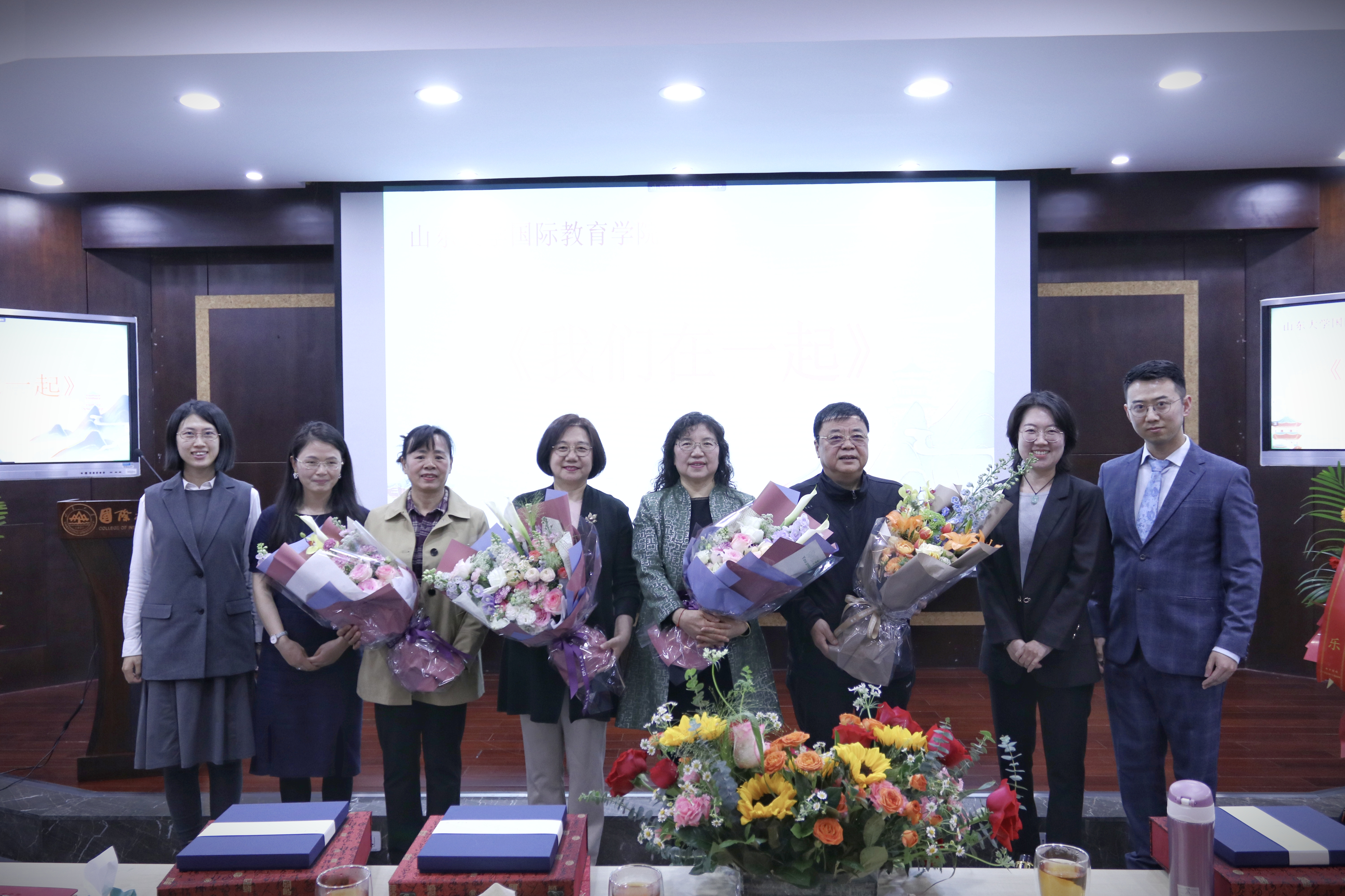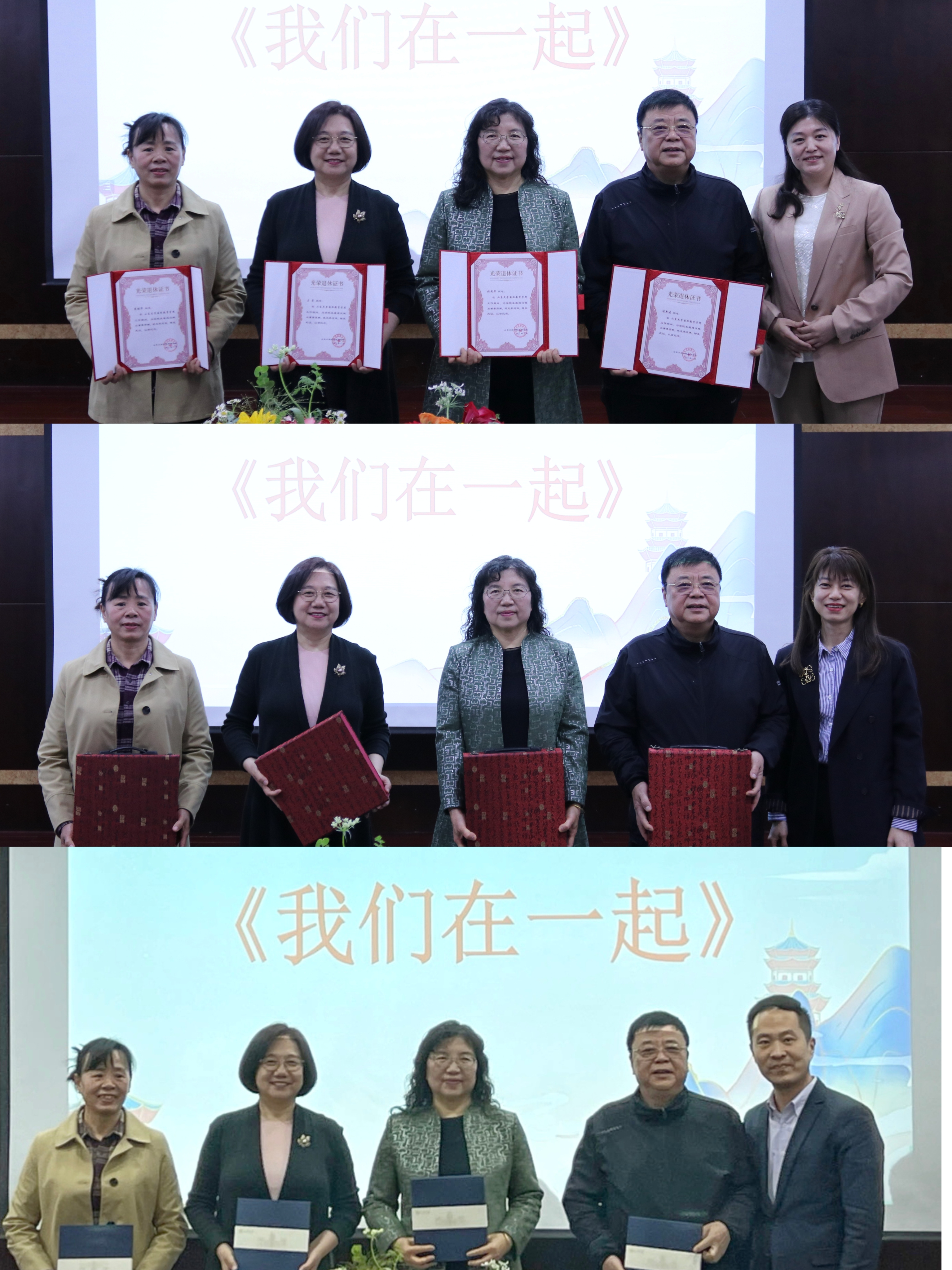 现场播放了由学院师生共同参与拍摄、学院工会精心制作的《我们在一起》荣休视频,引发了全场的回忆、笑声和感动。视频展示了四位教职工在不同人生阶段的剪影、同事间依依不舍的心情与数不尽的祝福。其中,四位荣休教职工的海外学生、朋友及子女送上的意外惊喜,使全场沉浸在美好动人的温情中。