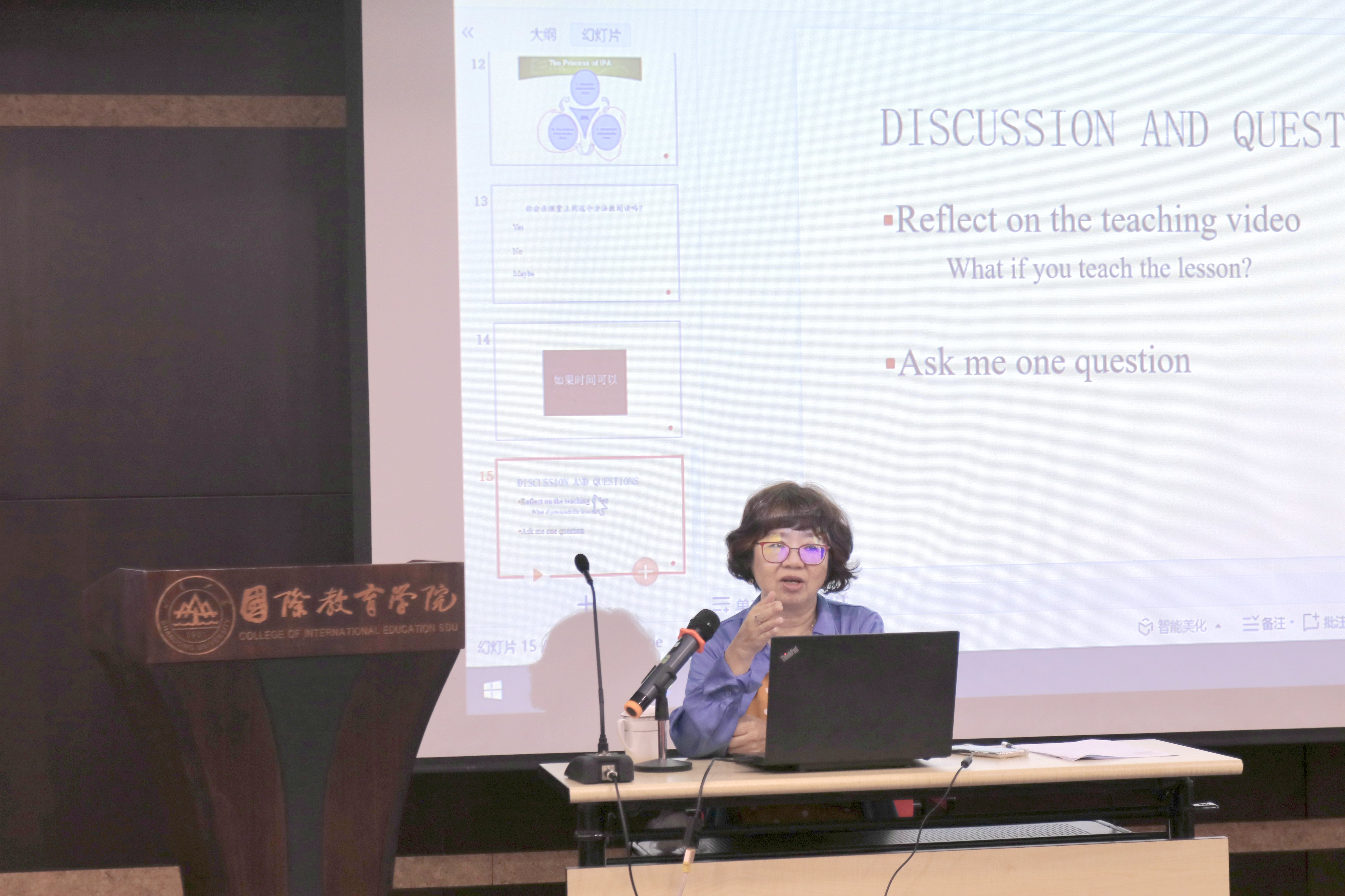 随后,张瑛播放了中国题材的教学视频,带领在场师生针对初级水平学生利用IPA进行阅读教学设计。她强调,在围绕关键词、词汇、短语和主要观点进行教学的基础上,还应充分考虑文化因素,介绍中国的独特文化。