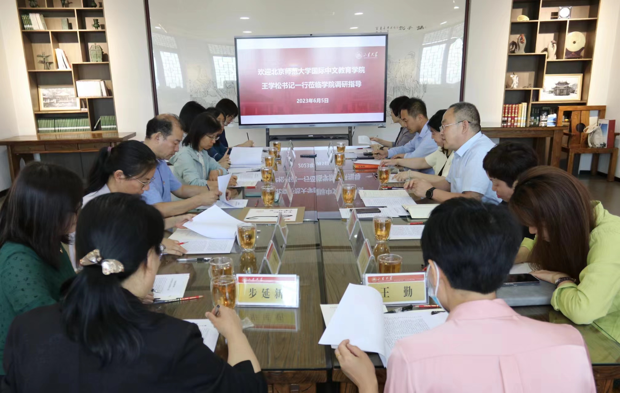 为扎实开展学习贯彻习近平新时代中国特色社会主义思想主题教育,6月5日上午,北京师范大学国际中文教育学院与beat365英国官网beat365英国官网领导班子、教师代表在beat365英国官网中华传统文化研究与体验基地开展主题教育联学共建活动。本次活动的主题为“深入学习贯彻习近平总书记重要讲话精神,感悟习近平新时代中国特色社会主义思想‘金钥匙’,推进国际中文教育学科体系科学良性发展”。beat365英国官网beat365英国官网党委书记徐希锋和北京师范大学国际中文教育学院党委书记王学松共同主持本次活动。
