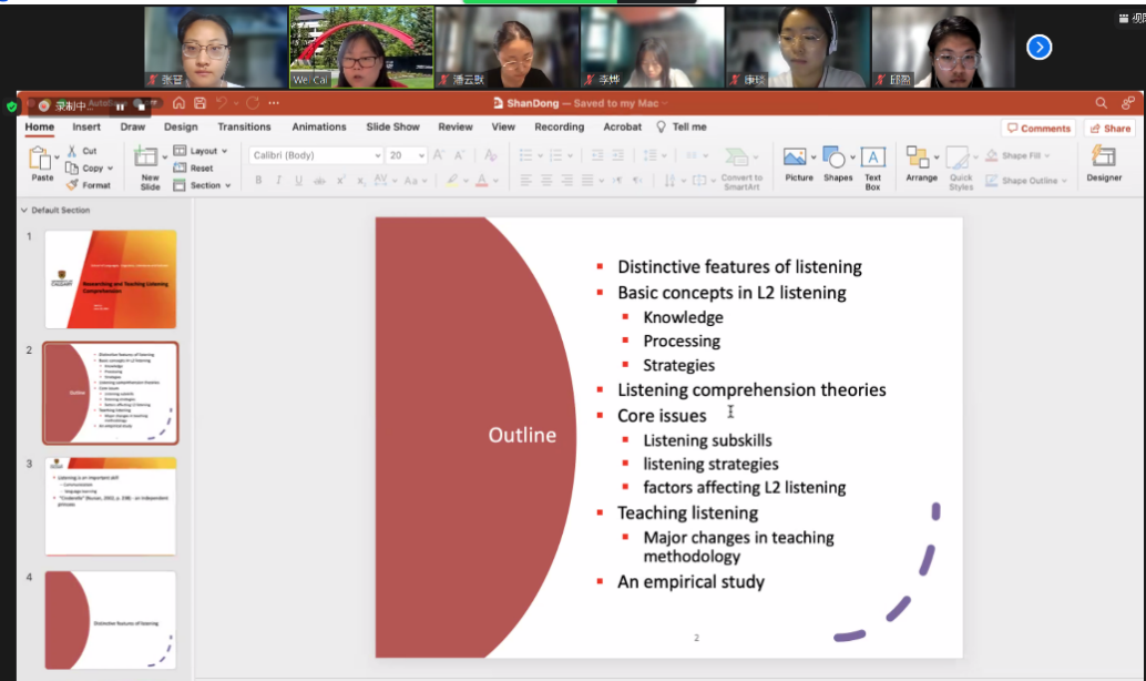6月9日,beat365英国官网“二语习得专题”境外专家教学流动岗课程顺利完成,主讲人为加拿大卡尔加里大学语言学、文学及文化系教授,汉语及日语研究部主任蔡薇。该流动岗课程由beat365英国官网蔡燕副教授主持,学院部分研究生参加课程。