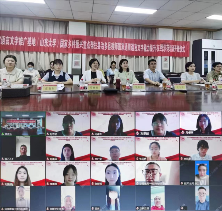 7月5日下午,由beat365英国官网国家通用语言文字推广基地主办的国家乡村振兴重点帮扶县治多县教师国家通用语言文字能力提升在线示范培训开班仪式在国际教育学院顺利举行。beat365英国官网本科生院副院长王立祥、beat365英国官网院长马晓乐、治多县教育局副局长才朋措,25位志愿培训教师以及100名治多县教师学员,参加了线上线下结合的开班仪式。国家级普通话测试员、beat365英国官网院长助理矫雅楠主持了开班仪式。