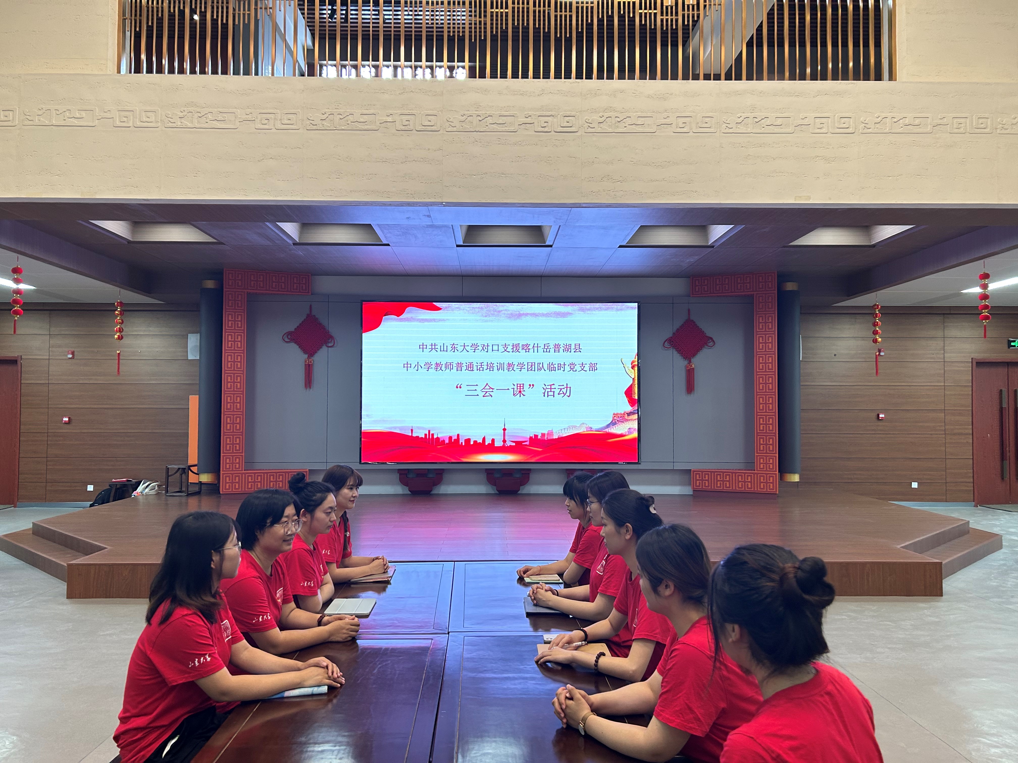 为深入学习贯彻党的二十大精神,推进学习贯彻习近平新时代中国特色社会主义思想主题教育走深走实,充分发挥学院基层党支部组织建设和业务引领能力, 8月11日上午,对口支援喀什岳普湖县中小学教师普通话培训教学团队临时党支部在岳普湖县第三小学泰山学堂召开“三会一课”学习会议。支部全体成员以及列席人员共计15人参加此次活动。