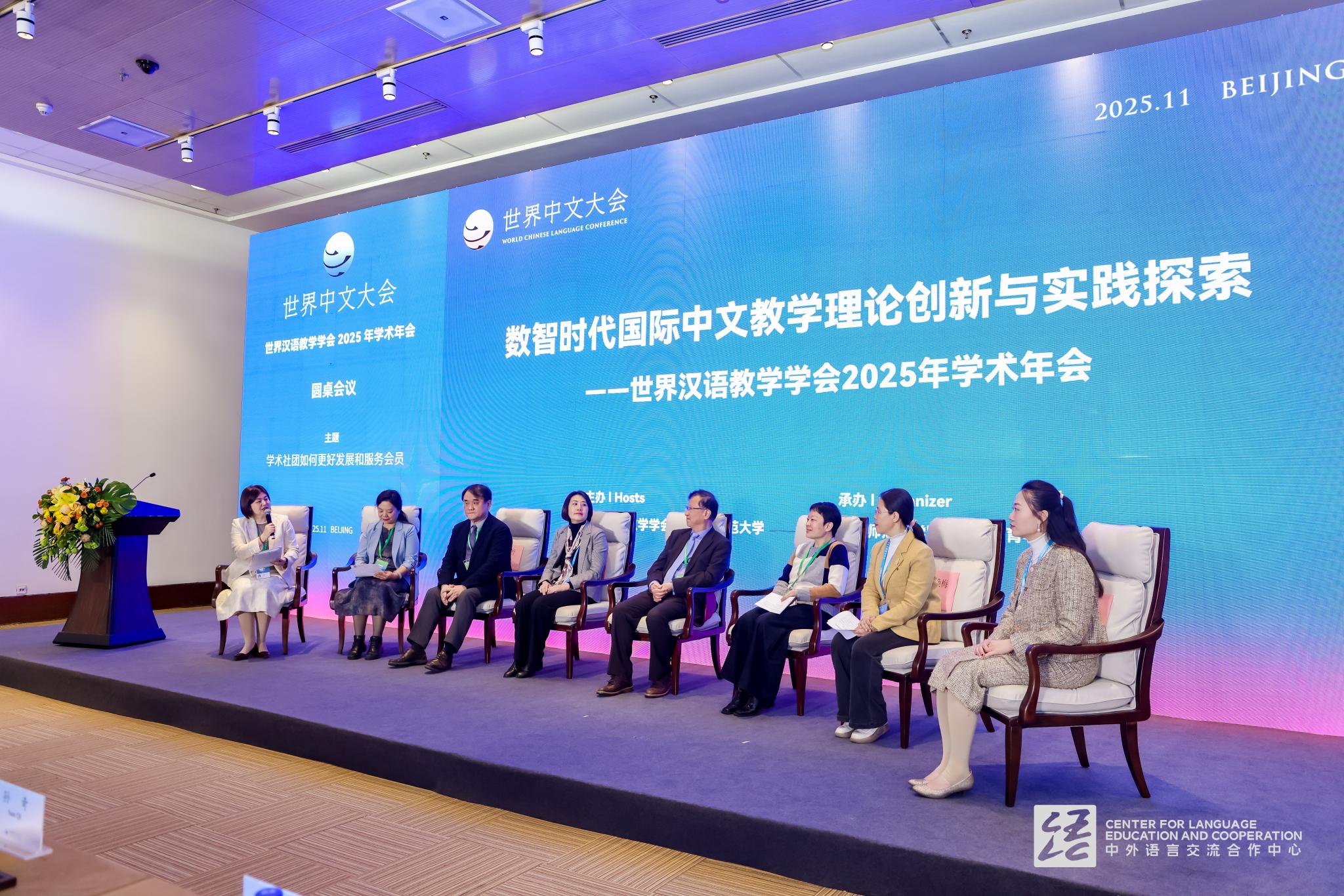 在世界汉语教学学会2025年学术年会上,马晓乐受邀主持“数智时代国际中文教学理论创新与实践探索”圆桌论坛。与会专家围绕学术组织的功能与价值、学术社团的数智化转型展开深入讨论。