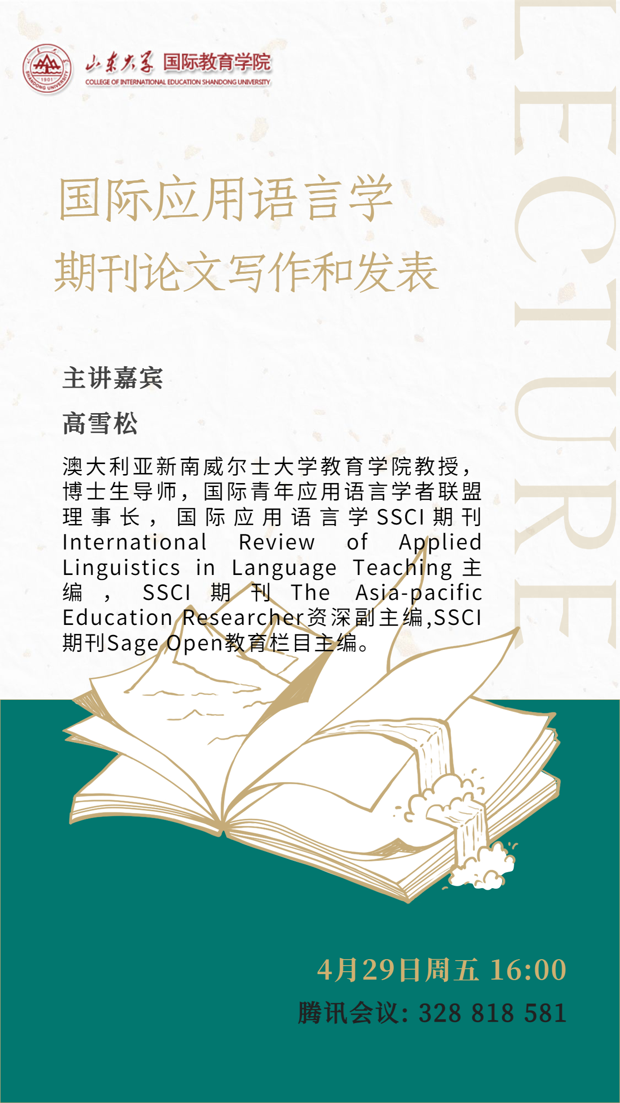 高雪松,澳大利亚新南威尔士大学教育学院教授,博士生导师,国际青年应用语言学者联盟理事长,国际应用语言学SSCI期刊International Review of Applied Linguistics in Language Teaching主编,SSCI期刊The Asia-pacific Education Researcher资深副主编,SSCI期刊Sage Open教育栏目主编。