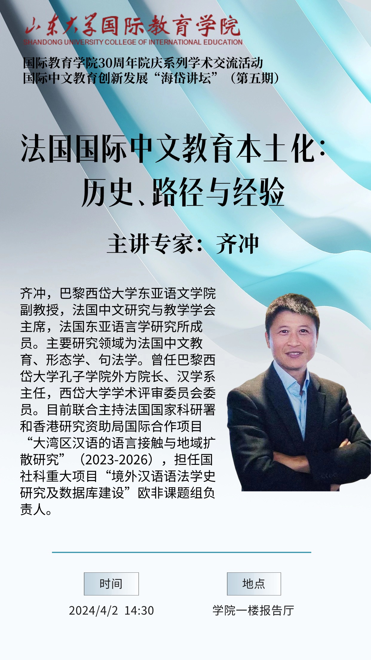 齐冲,巴黎西岱大学东亚语文学院副教授,法国中文研究与教学学会主席