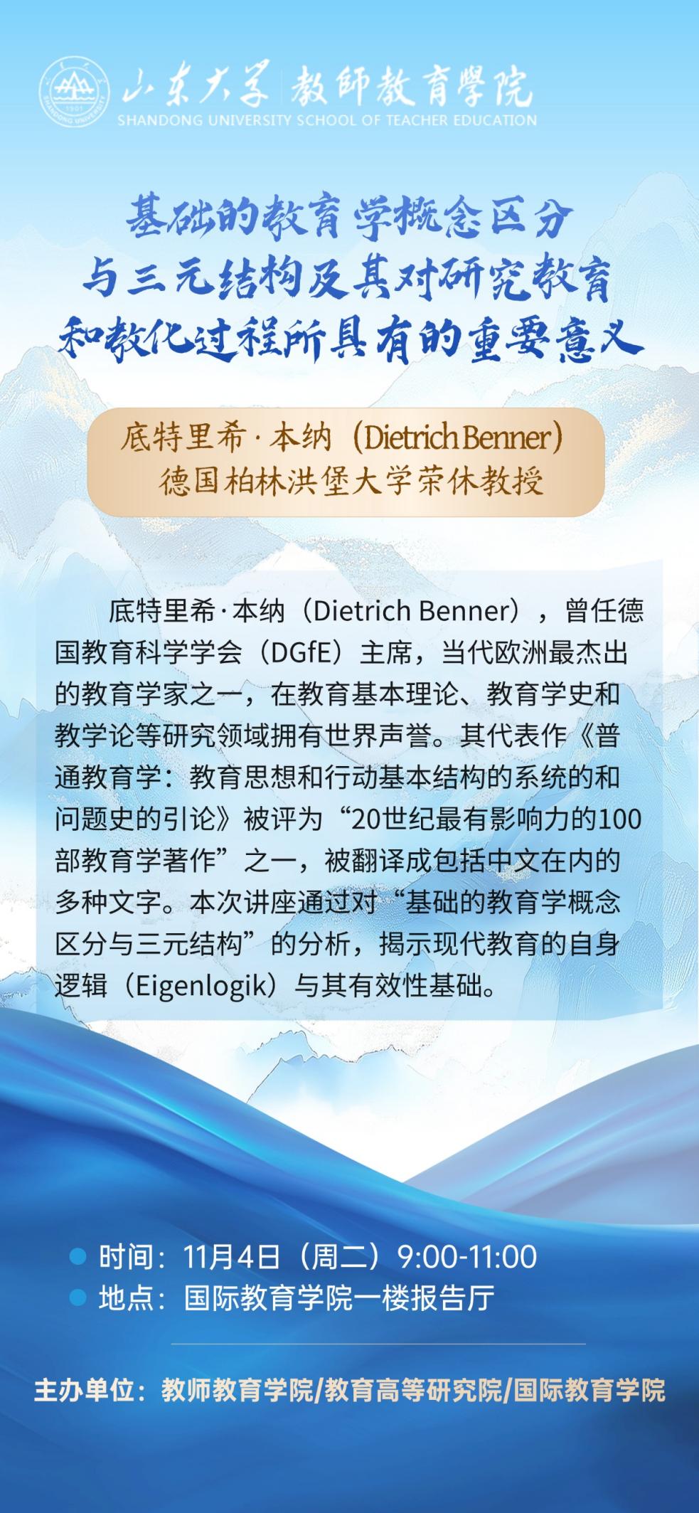 底特里希·本纳(Dietrich Benner),德国柏林洪堡大学荣休教授,曾任德国教育科学学会(DGfE)主席,当代欧洲最杰出的教育学家之一,在教育基本理论、教育学史和教学论等研究领域拥有世界声誉。其代表作《普通教育学:教育思想和行动基本结构的系统的和问题史的引论》被评为“20世纪最有影响力的100部教育学著作”之一,被翻译成包括中文在内的多种文字。本纳教授与中国保持了二十多年的友谊,曾经十多次来到中国进行讲学和学术交流,2009年被聘为华东师范大学顾问教授。