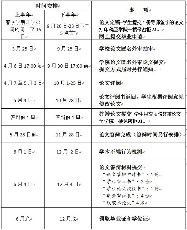 凡完成培养方案所规定的各项要求,考试合格并取得规定的总学分,完成学位论文,经导师审核同意后,方可申请论文答辩。论文答辩时间如下。