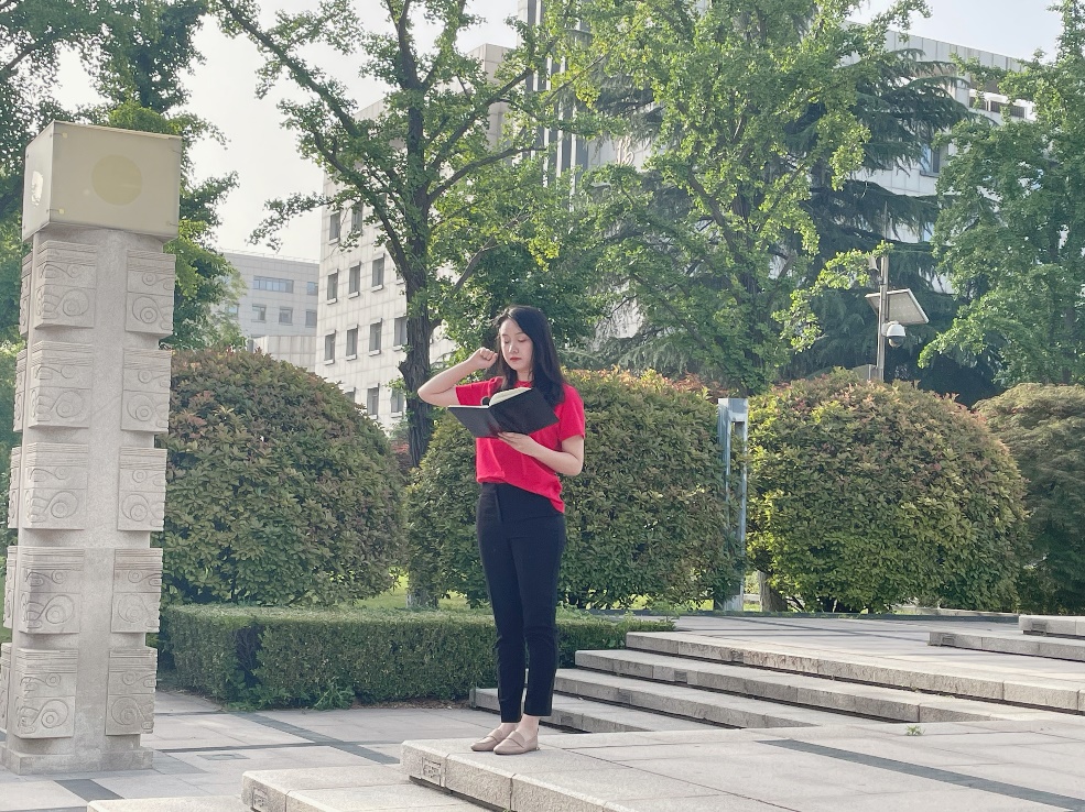 升旗仪式最后,2020级研究生团支部书记李静悦带领全体同学重温入团誓词:“我志愿加入中国共产主义青年团,坚决拥护中国共产党的领导,遵守团的章程,执行团的决议,……”同学们的宣誓铿锵有力,慷慨激昂,传递出他们身为共青团员的决心和信念,展示了他们作为青年学子奉献国家的坚定理想和追求。