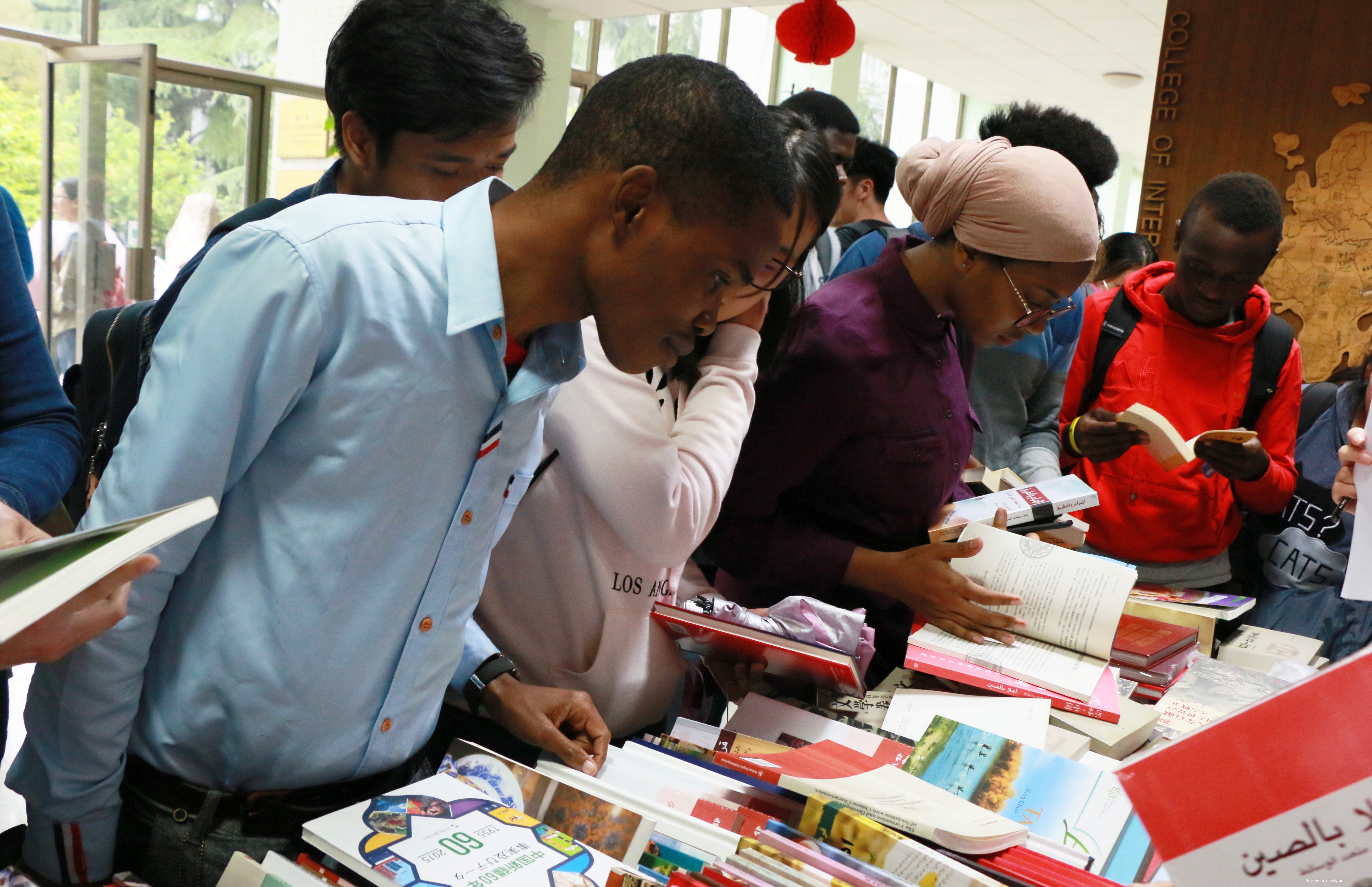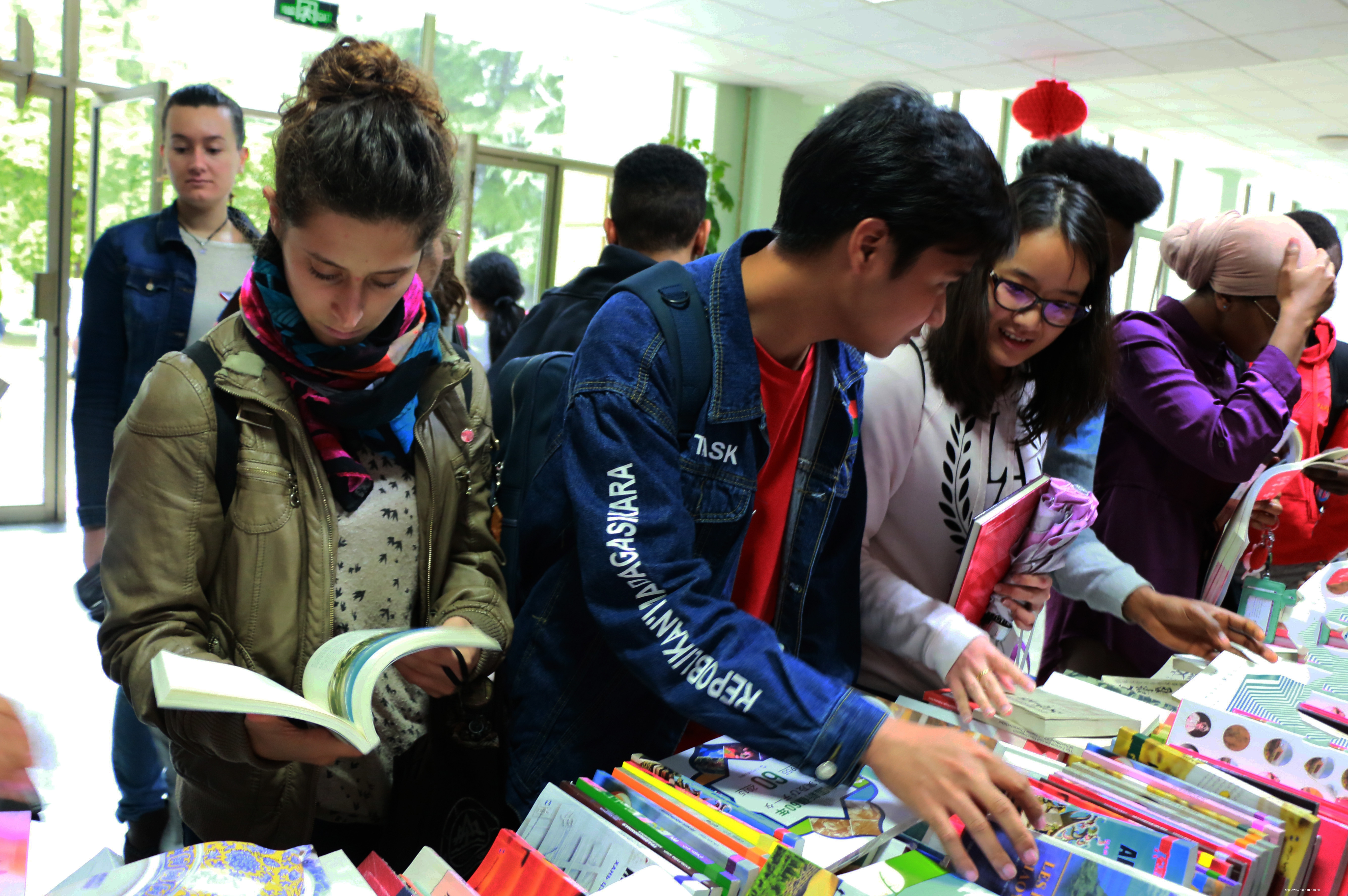 此次义卖的书籍涵盖文化、文学、社会、军事和政治等多个领域,有中文、英语、法语、西班牙语、阿拉伯语等多国语言版本,皆为内容充实、立意高远的优秀作品。图书义卖秉承“书韵悠长 物尽其用”的原则,定价十分低廉,受到中外学生的热烈欢迎。志愿者们耐心地为前来购书的学生们推荐适合的书籍,其中《汉字王国》和《中国》系列尤其受同学们的青睐。经过一个下午的图书义卖活动,所有人都收获满满。