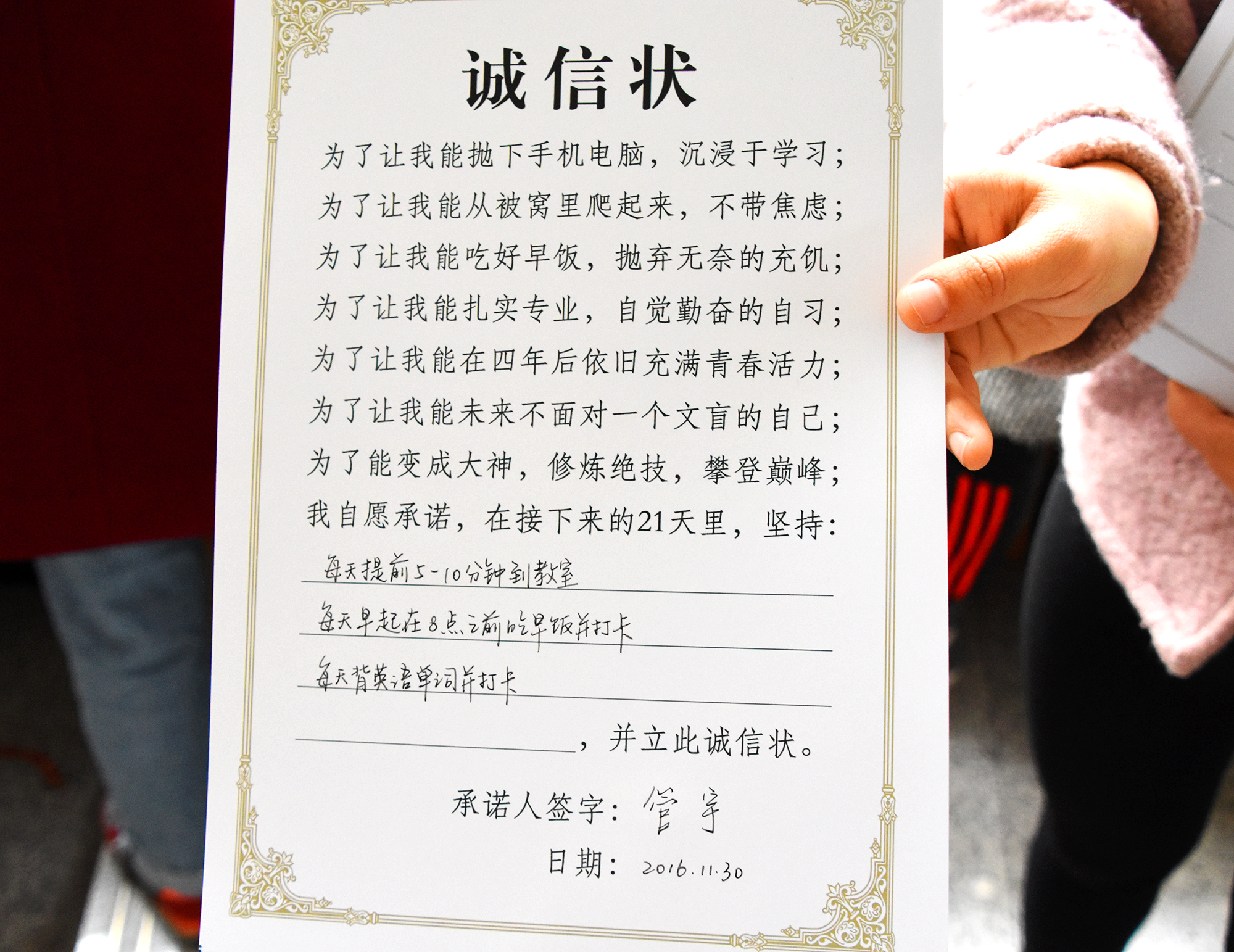 学生会在广泛征求学生意见之后,确立了“相约吃早饭”,“提前进教室”,“我爱记单词”和“相约晚自习”四个主题活动。本次”诚信状“主题活动活动采用体验式教育的模式,让学生根据自己的实际情况选择参与主题,立下并签署”诚信状“,承诺21天连续完成此项主题任务,并以此促进行为习惯的养成。活动现场,学生会学习部部长胡晓璠、生活部部长袁艳丽为大家分发诚信状,同学们纷纷选择自己感兴趣的活动主题,在诚信状上郑重地签上自己的名字,随后大家合影留念,记录下着庄严的时刻。