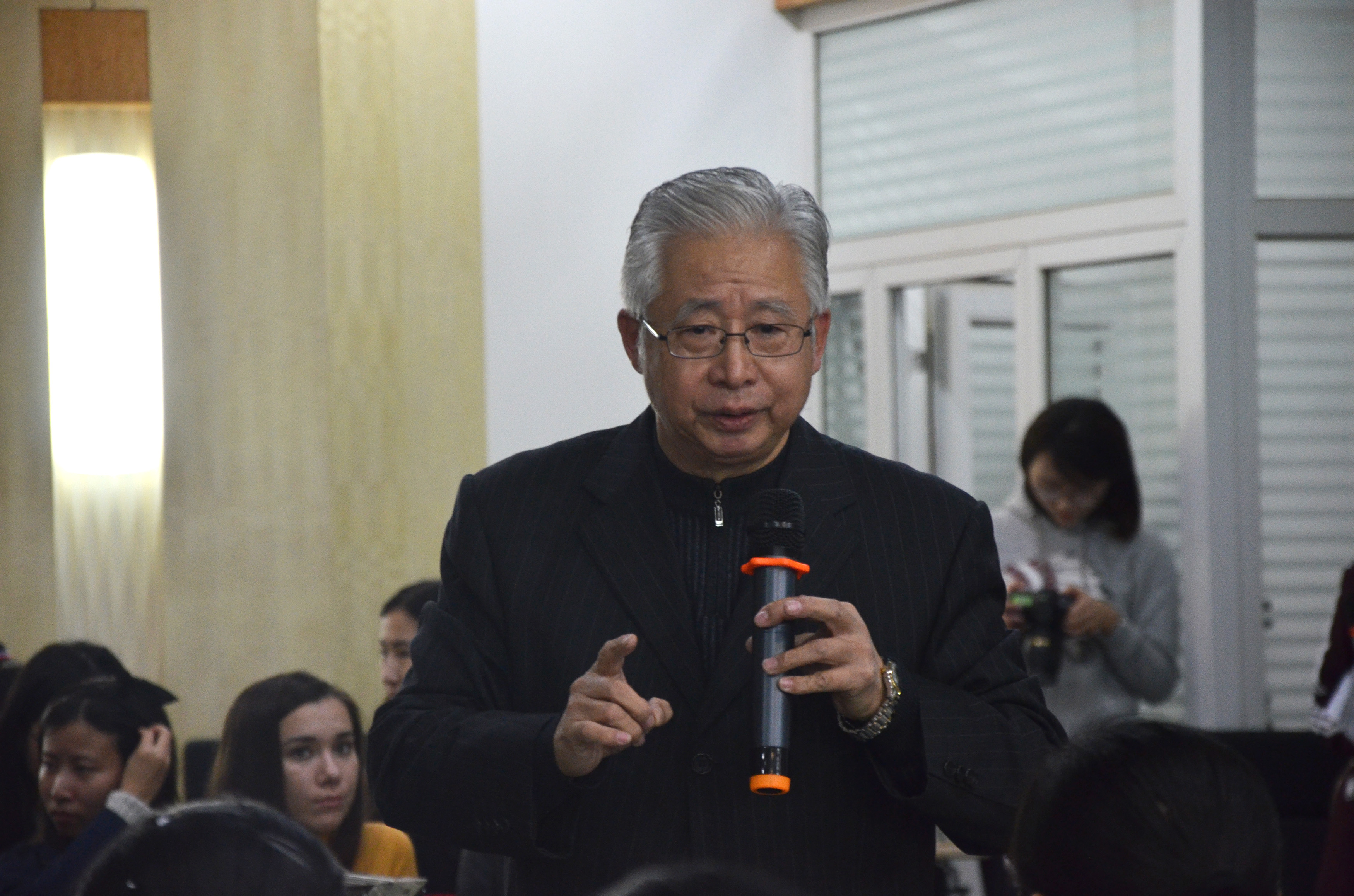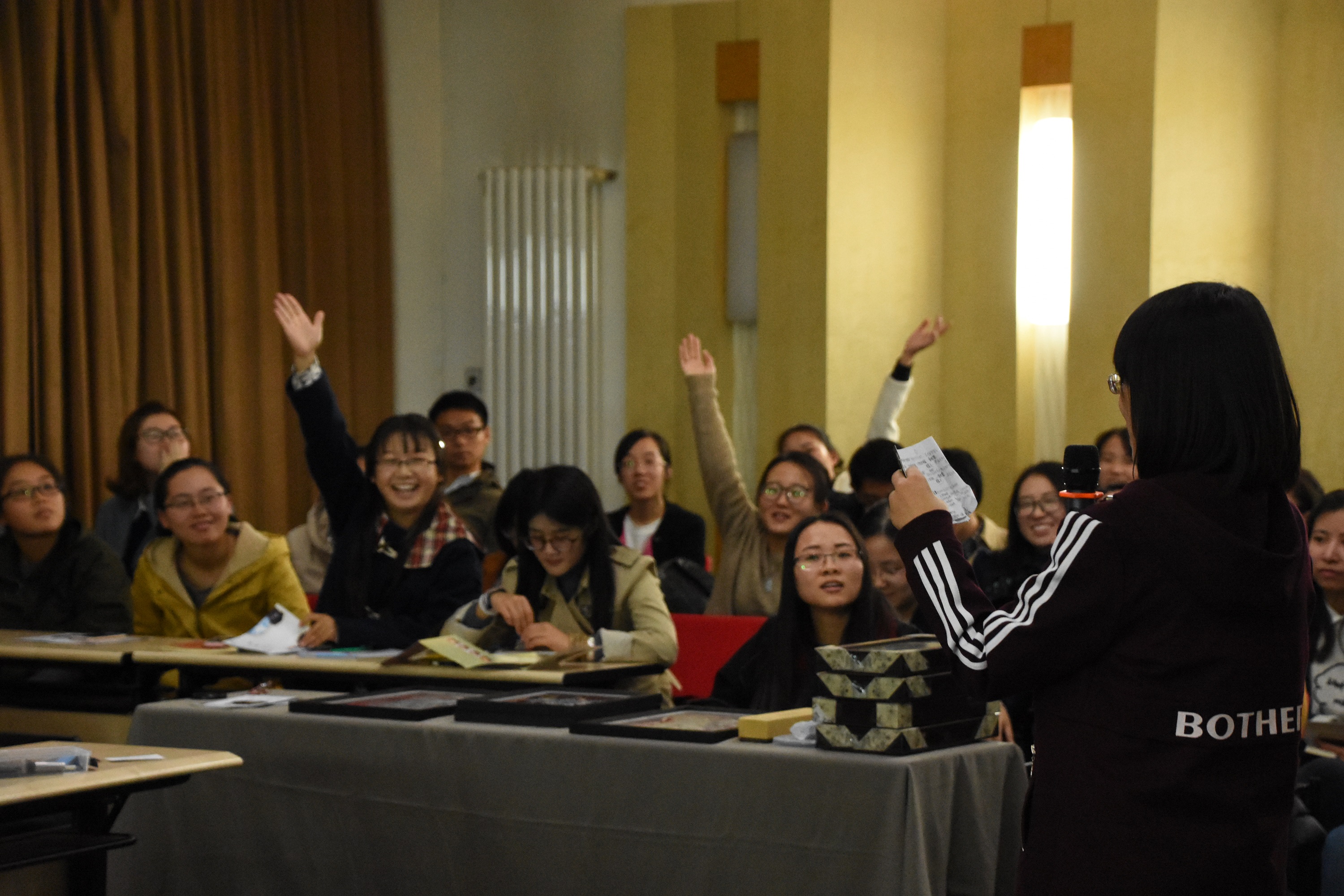 在随后的交流环节里,主持人向我们提出了有关非物质文化遗产的传承发展的问题,同学们各抒己见,用智慧碰撞出满场的火花,将全场气氛推向又一个高潮。活动最后,全体同学与单老合照留念。