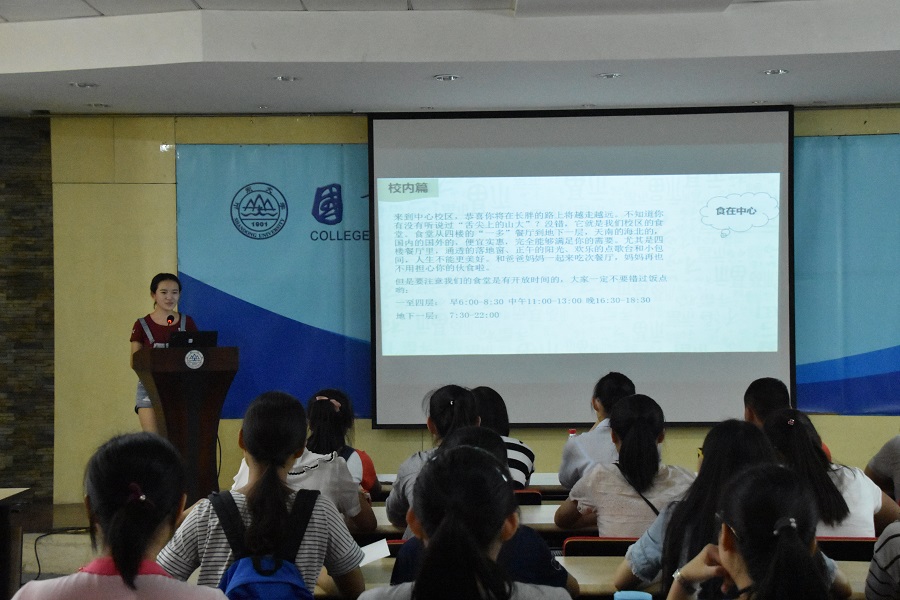 讲座伊始,学生会生活部部长袁艳丽向新生们介绍了beat365英国官网的基本情况,并以“学在中心”为主题讲解了新生最关心的自习室、课程安排等学习问题。随后,副部长陈文倩、方芳从“食在中心”、“住在中心”、“购在中心”、“乐在中心”等几个方面生动地介绍了beat365英国官网中心校区的生活贴士,以自己的生活经验为新生们提供了细致全面的温馨小贴士。