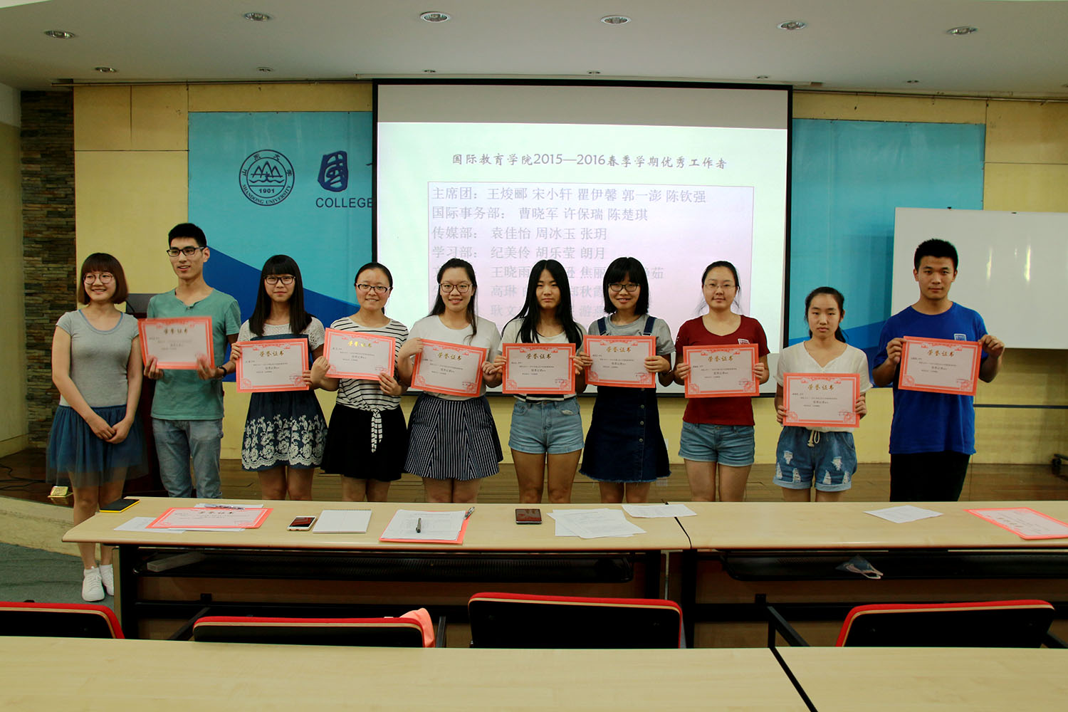 王焌郦首先代表学生会全体成员对本届学生会工作进行总结,她以时间轴的方式,将各部门一年来举办的各类重点活动一一梳理,2015-2016学年共组织了20余场活动,同学们根据兴趣选择参加,她指出,第三届学生会的活动在延续经典的基础上进行了完善,并有魄力、有勇气地进行了创新,学生会的活动,为提升学院校园文化氛围,扩大学院影响力做出了突出贡献。此外,她也坦诚表达了学生会工作中的一些遗憾,比如学生参与度有所下降,活动策划仍需超精品化方向发展。作为主席,她也非常感谢学生会全体成员一年来对她的工作的配合与支持。随后,学院对2015——2016学年第二学期表现优异的学生会成员进行表彰,并颁发优秀证书。