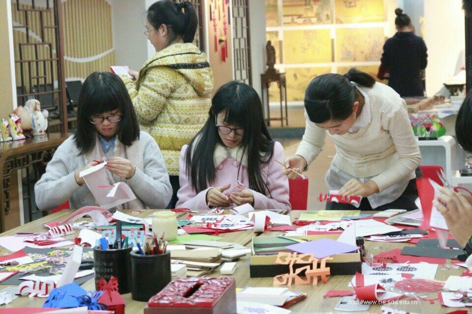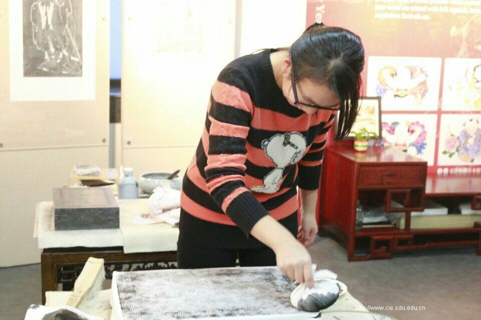 之后同学们分为两组,交替参加碑拓的学习和剪纸活动。参与碑拓的同学在欣赏了墙上不同风格的作品后,渐渐对纸墨移形的奥秘有了初步的认识。在老师的指导下,同学们都相继完成了精美的碑拓作品,既有衣带飘风的孔子画像,亦有庄严肃穆的警世格言。而那些或具有浓郁的中国特色、或散发着时尚现代气息的剪纸作品,也吸引了很多同学借手中的刀纸一探剪艺世界的精彩。形状各异、创意无限的各类“喜”字、“福”字,便寄寓了他们对剪纸文化的独道之解。