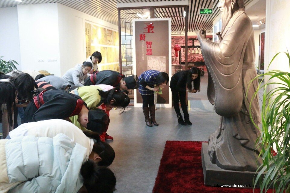 最终,同学们相聚于儒学大师孔子的青铜像前,试穿汉服,学习礼数。面对绮丽飘逸的汉服,大家都争相试穿,可惜数量有限,只有两位男生和两位女生最终能披罗服之璀璨,展华裳之艳逸。而其他的同学同他们一起,学习了三拜孔子的礼节,以举手投足间的风范,表达了对智慧先哲最真挚的敬意。