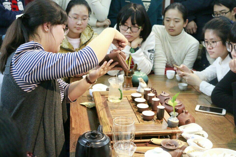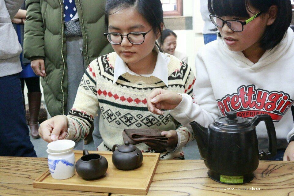 首先来到的是茶文化体验区。陈老师为同学们介绍了茶的分类以及茶具名称与功能,并亲自演示了乌龙茶的泡茶流程。为了使大家更好地领略千年茶韵,老师将同学们分为六个小组,后三个小组同泡乌龙以斗茶,而前三个小组在品评之余,也要泡制红茶、绿茶等答谢他们的辛劳。氤氲的茶香很快便在基地散开,在这一品一泡之间,同学们不仅对茶文化有了更深切地体会,也增进了珍贵的友谊。