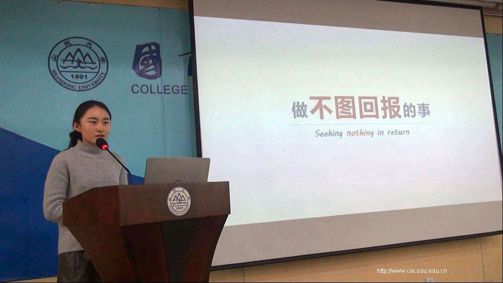 赵杰民以“诚信、友善”为主题,用自己绘声绘色的演绎以及与留学生之间深厚的友谊赢得了观众的阵阵掌声。董怡璇用自己丰富的志愿活动经历让大家感受到志愿服务带给他人、带给自己的深切感动。来自香港的郑明月将自己在山大一年多的生活经历与观众分享,非常动情的表达她对老师、同学的感恩之情。