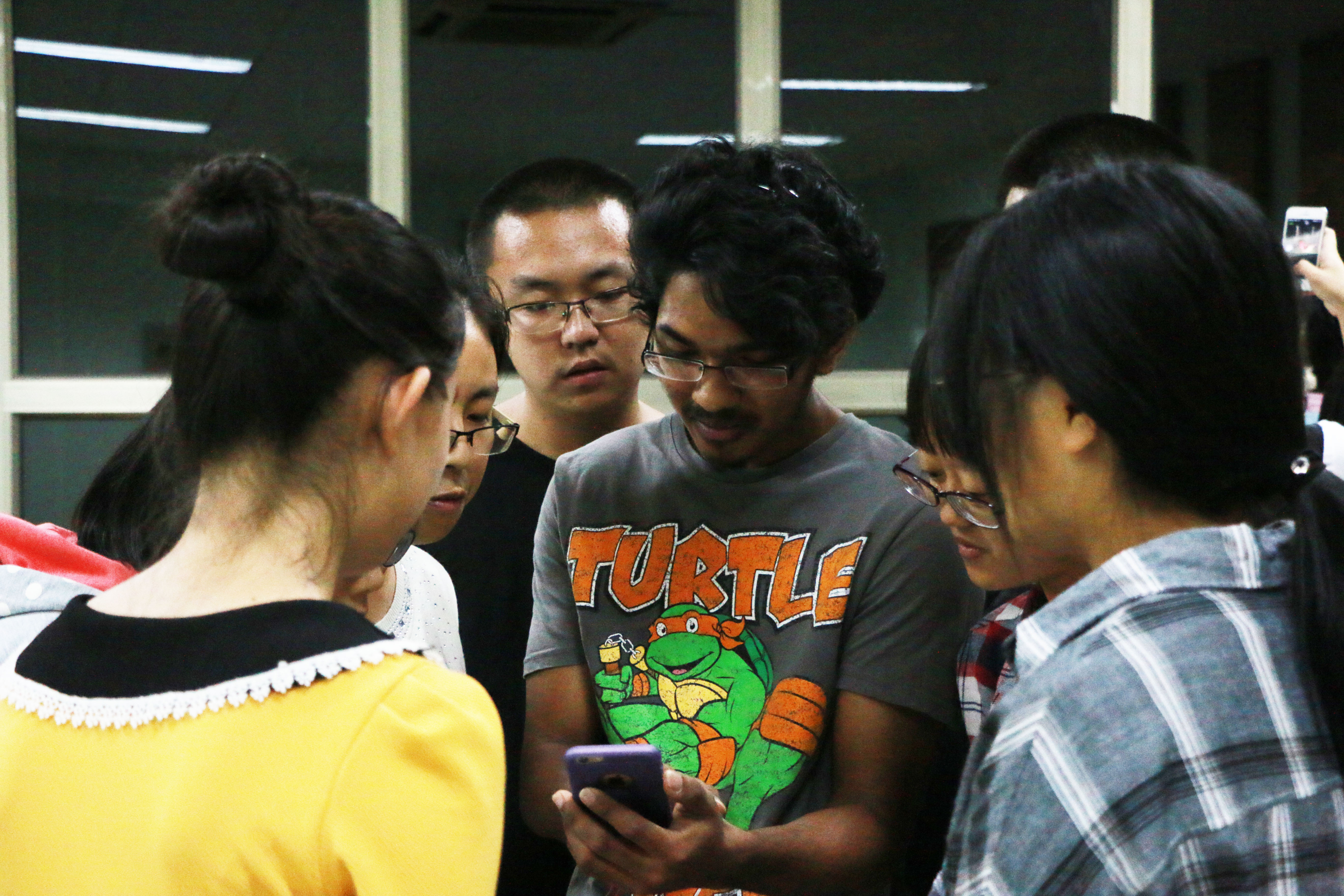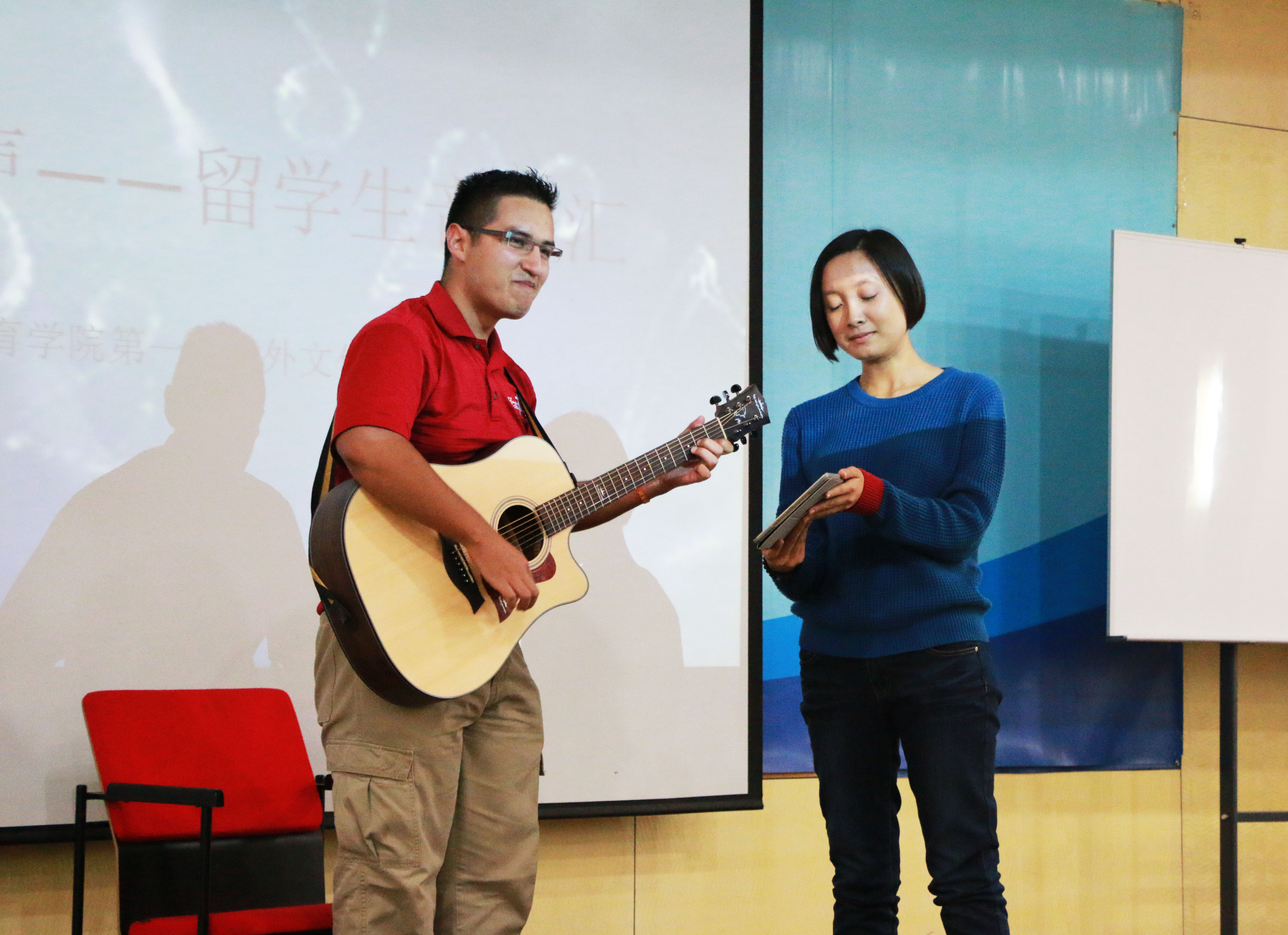 首先是歌曲表演与教授环节。第一首歌曲是由4位韩国留学生带来的吉他弹唱《贝壳》,观众受到现场氛围的感染,一齐随着旋律拍打起节奏。接下来,圭亚那留学生李瑞龙演唱的民族歌曲饱含了对祖国的赞美与热爱:美丽的热带雨林,富饶多样的物产,热情智慧的人民。感情满满的音乐赢得了热烈的掌声。最后,墨西哥留学生查尔斯献上的吉他弹唱令人陶醉,引人遐思。歌曲表演完毕,由观众作为学员挑选留学生导师并向其学习歌曲。现场观众积极踊跃,气氛异常热烈。分组后,“学歌队伍”在学院大厅开始了歌曲学习。导师认真地教,学员投入地学,虽然语言不同,但是心意相通。