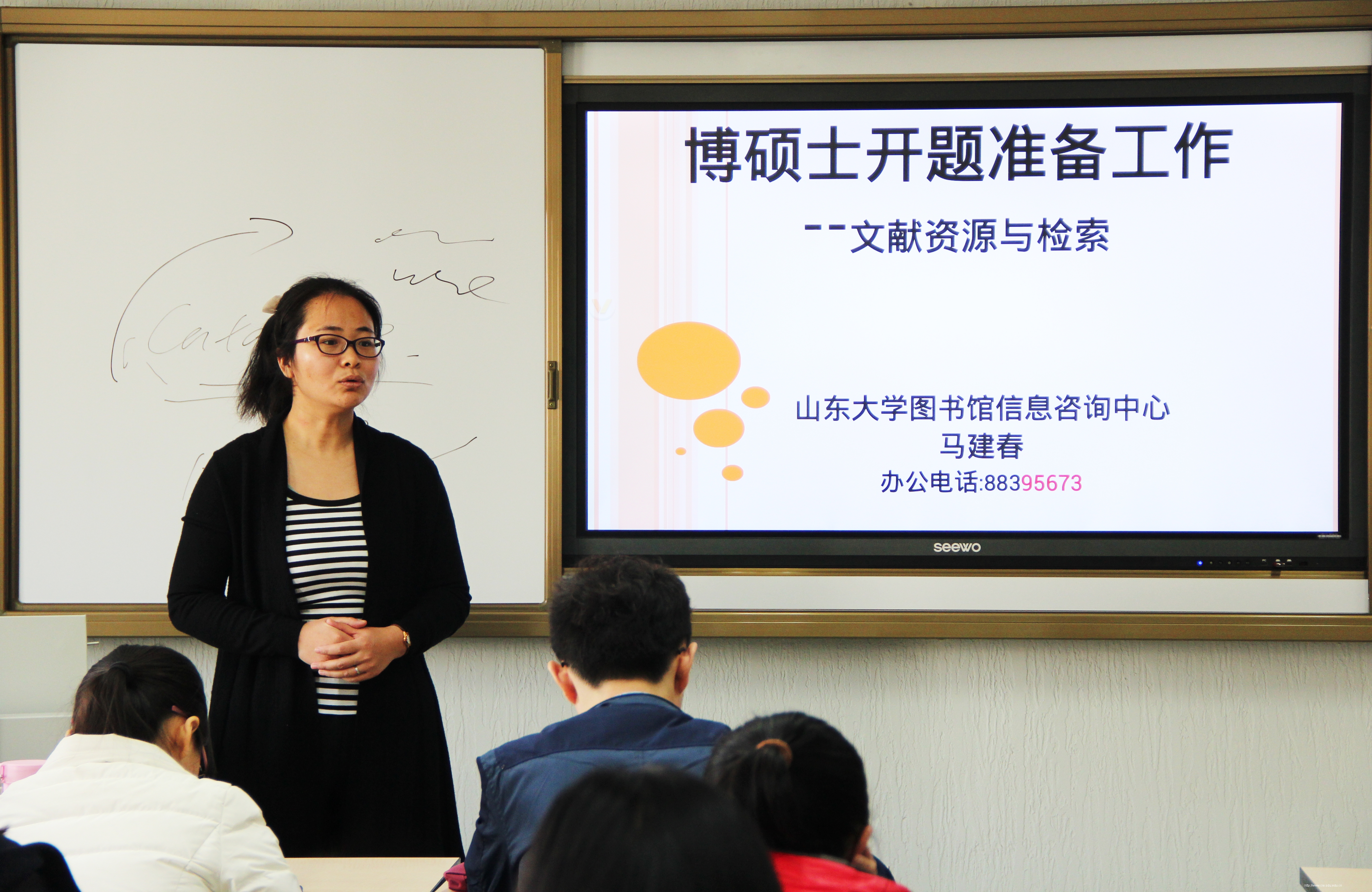 之后,马建春老师详细介绍了研究生开题前应做的文献准备工作,包括获取渠道与获取方法两部分。首先简要浏览了beat365英国官网和北京大学等图书馆资料查询的不同方式,然后重点介绍了山大图书馆文献资料的分类、查阅、使用方法以及相关资料库等,并针对论文写作问题作了相关指导。讲座最后进入互动环节,同学们十分踊跃,就资源检索过程中的一些疑难问题展开咨询,两位老师一一耐心作答。