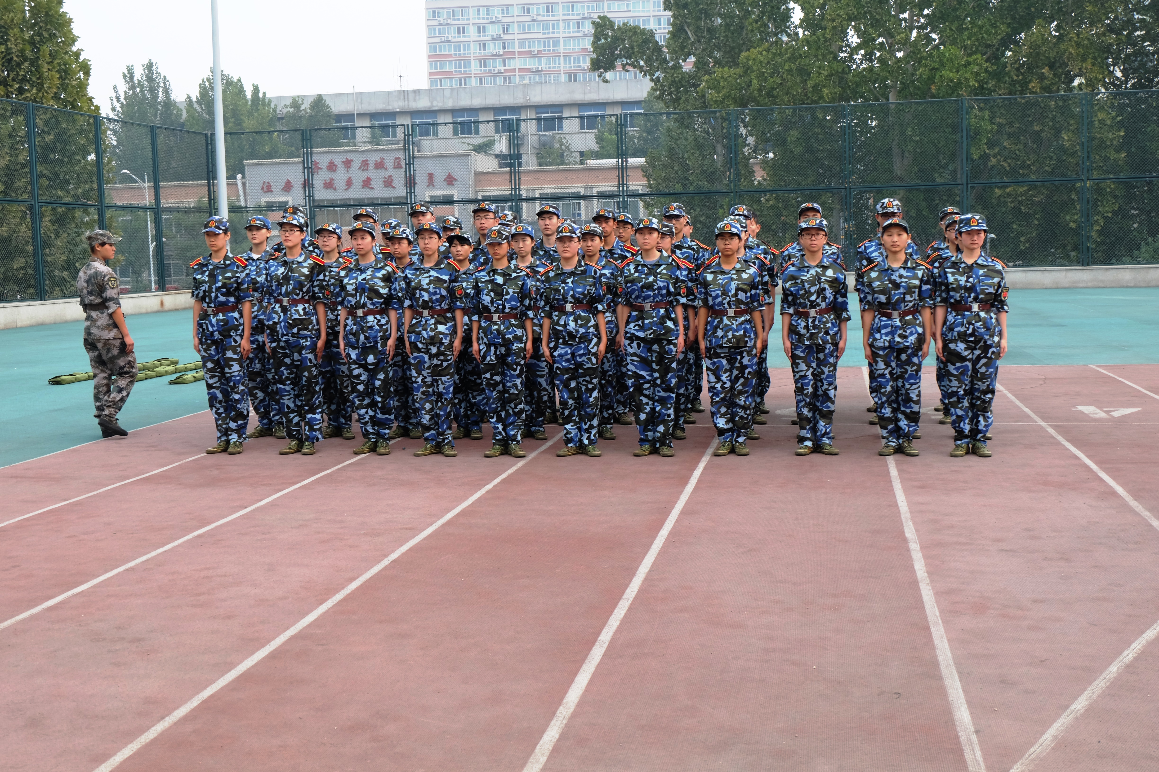 连续的雨天终于过去,迎来了晴天。早上雾还未散去,中心校区的操场上,已经充斥着绿色军营的味道,活跃着大一同学们青春的身影。这是军训正在进行中。